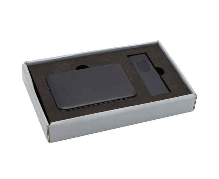 Подарочный набор в стильной цветной картонной коробке серого цвета (крышкой-дно). Внутри на аккуратном ложементе расположены внешний аккумулятор емкостью 5000 mAh и электронная зажигалка. Компактный и мощный внешний аккумулятор обеспечивает надежное подзаряжание мобильных устройств в любое время, а современная электронная зажигалка сочетает в себе удобство и безопасное использование без огня. Этот набор станет практичным и элегантным подарком для людей, ценящих функциональность и стиль.