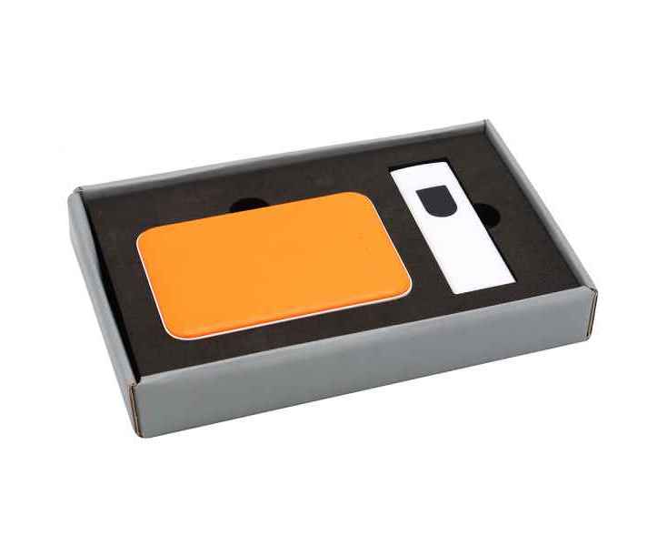 Подарочный набор в стильной цветной картонной коробке серого цвета (крышкой-дно). Внутри на аккуратном ложементе расположены внешний аккумулятор емкостью 5000 mAh и электронная зажигалка. Компактный и мощный внешний аккумулятор обеспечивает надежное подзаряжание мобильных устройств в любое время, а современная электронная зажигалка сочетает в себе удобство и безопасное использование без огня. Этот набор станет практичным и элегантным подарком для людей, ценящих функциональность и стиль.