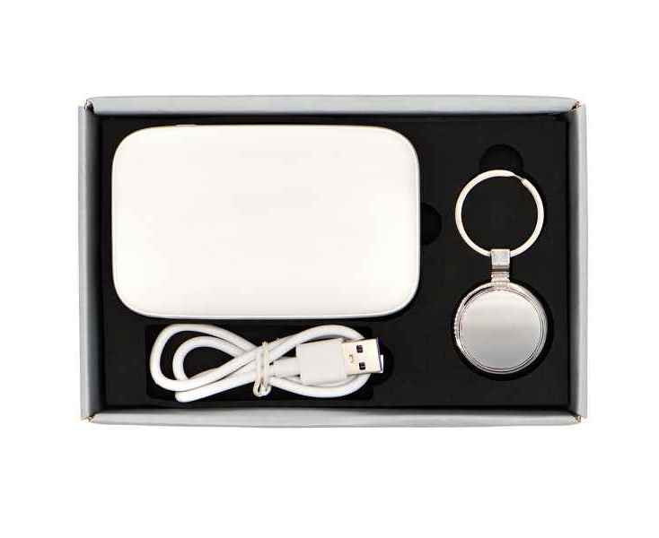 Подарочный набор в элегантной цветной картонной коробке серого цвета с конструкцией крышка-дно. Внутри расположены аккуратно закрепленные на ложементе внешний аккумулятор емкостью 10000 mAh с быстрой зарядкой, и металлический карманный брелок. Внешний аккумулятор обладает компактным дизайном и обеспечивает надежный запас энергии для мобильных устройств в пути, а стильный металлический брелок станет практичным и эстетичным аксессуаром для ключей. Этот набор идеально подходит в качестве презента для тех, кто ценит удобство, качество и современный стиль.