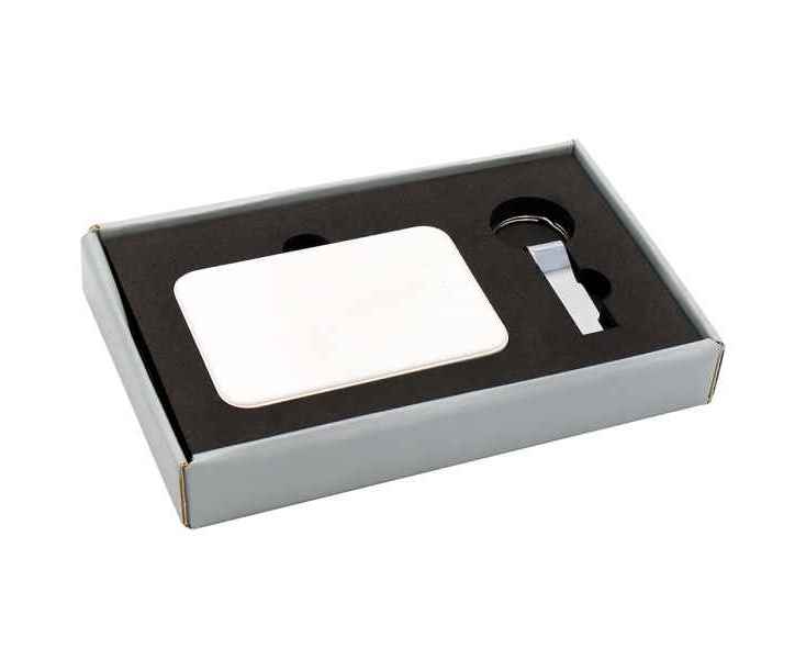 Подарочный набор в стильной цветной картонной коробке серого цвета (крышкой-дно). Внутри на аккуратном ложементе располагаются внешний аккумулятор емкостью 5 000 mAh и элегантная флэшка емкостью 16 ГБ в прочном металлическом корпусе. Мощный аккумулятор обеспечивает быстрое и надежное подзаряжание мобильных устройств в любых условиях, а флэшка сочетает вместительность и изысканный дизайн, надежно защищая ваши данные. Этот комплект станет отличным подарком для современных и активных людей, ценящих качество, функциональность и стиль.