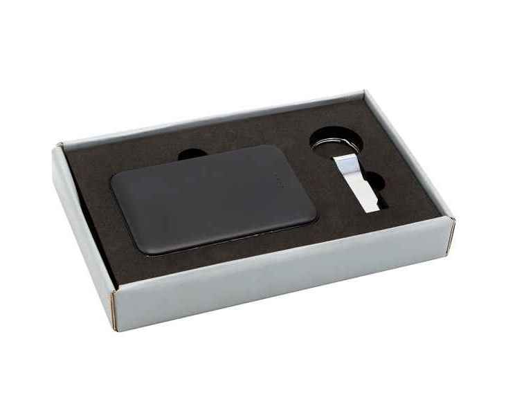 Подарочный набор в стильной цветной картонной коробке серого цвета (крышкой-дно). Внутри на аккуратном ложементе располагаются внешний аккумулятор емкостью 5 000 mAh и элегантная флэшка емкостью 16 ГБ в прочном металлическом корпусе. Мощный аккумулятор обеспечивает быстрое и надежное подзаряжание мобильных устройств в любых условиях, а флэшка сочетает вместительность и изысканный дизайн, надежно защищая ваши данные. Этот комплект станет отличным подарком для современных и активных людей, ценящих качество, функциональность и стиль.