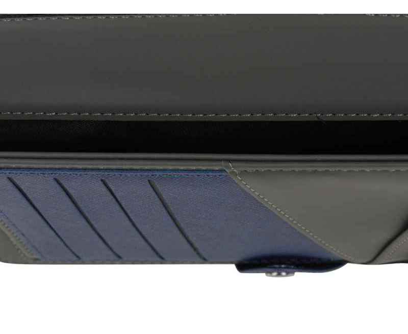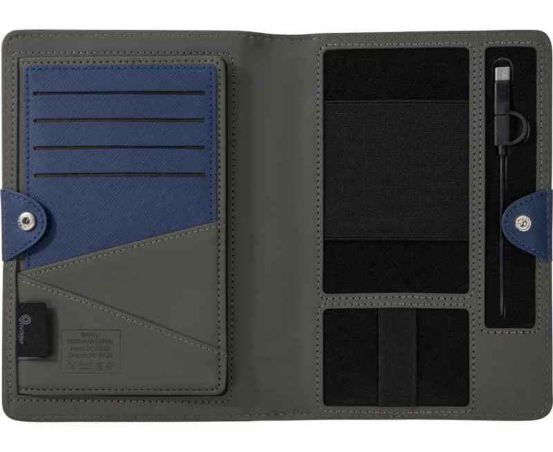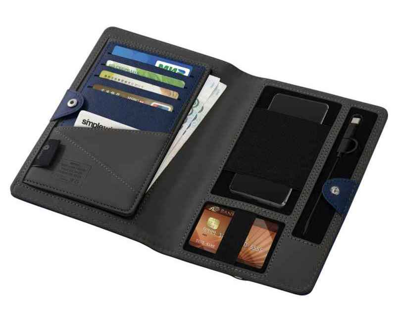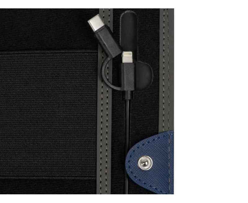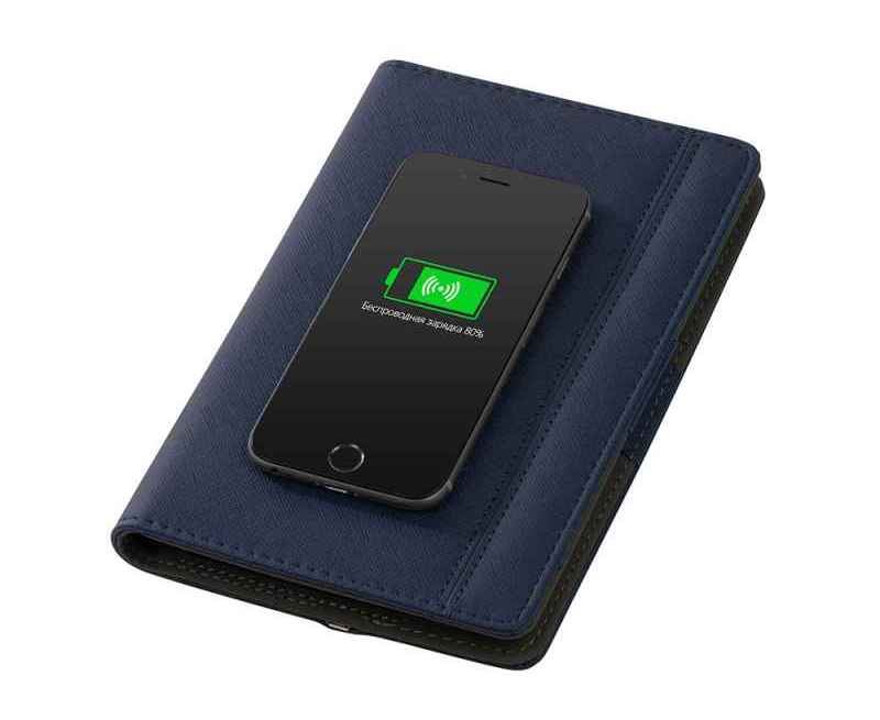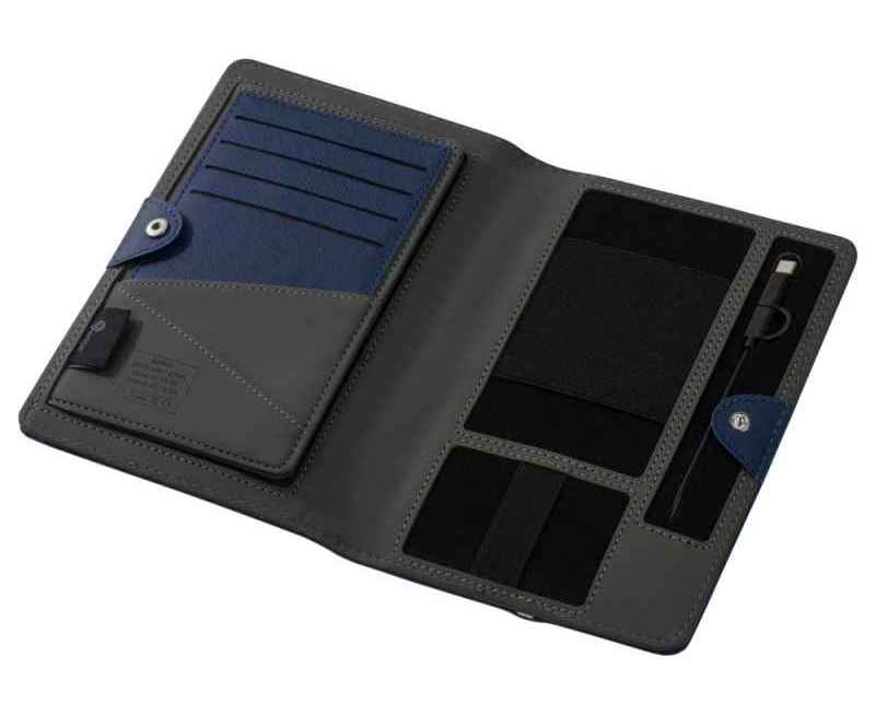 Органайзер закрывается на кнопку, имеет фиксирующие резинки для проводов и других мелочей, а также большой карман, отсек для паспорта и 4 — для карточек. Для проводной зарядки предусмотрен встроенный провод.