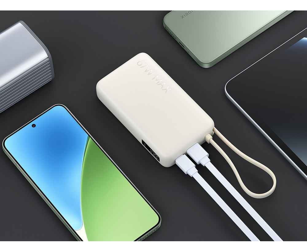 Xiaomi 67W Power Bank 10000 (Integrated Cable) — мощный и компактный внешний аккумулятор с ёмкостью, эквивалентной 10 000 мА·ч, и встроенным USB‑C кабелем для удобной зарядки без лишних проводов. Модель поддерживает двустороннюю быструю зарядку до 67 Вт и может одновременно заряжать несколько устройств благодаря трем портам.