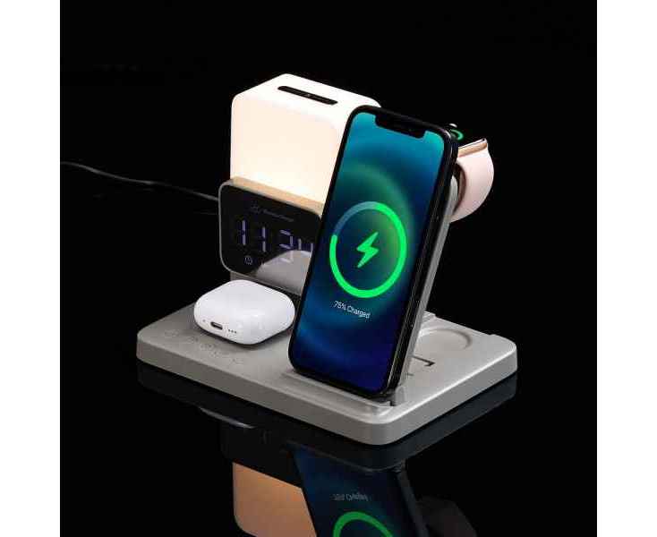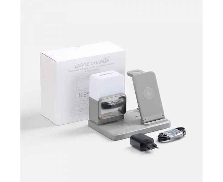 Large Charge — многофункциональное устройство, которое сочетает в себе функции станции для проводной и беспроводной зарядки разнообразных устройств, настольных часов с будильником и лампы.