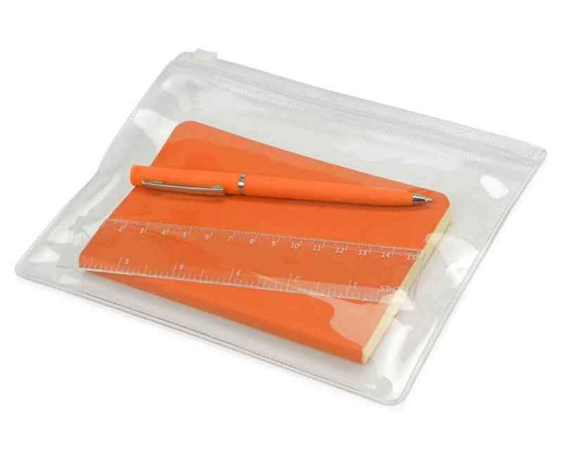 В канцелярский набор входит прозрачный пенал из ПВХ с zip-замком и линейка, блокнот формата А6 в мягкой обложке с закругленными углами, элегантная пластиковая ручка с хромированными деталями. Корпус ручки с приятным тактильным soft-touch покрытием.