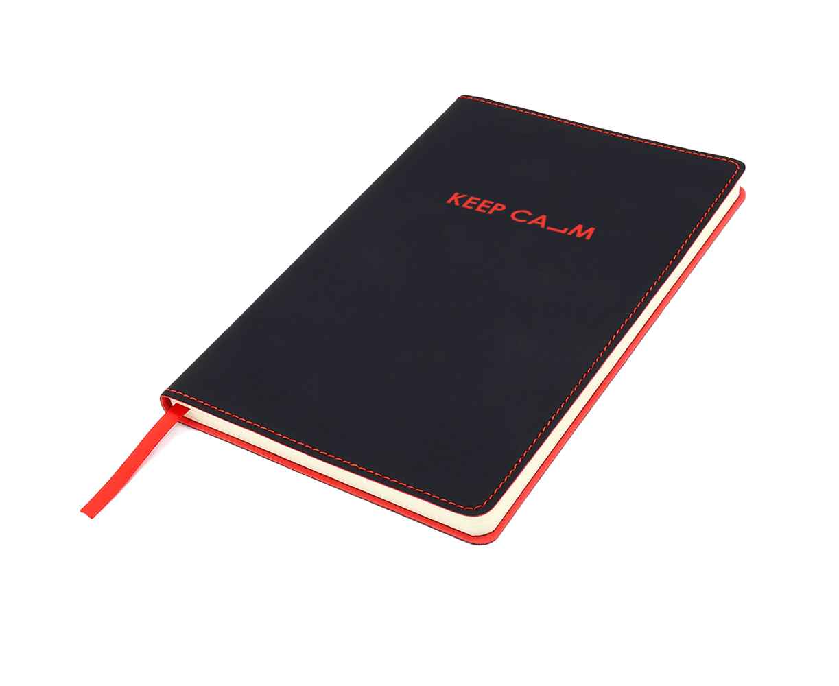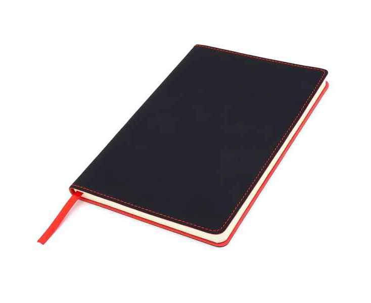 Блонот формата А5 в мягкой обложке из искусственной кожи. Материал обложки - термополиуретан. Основной цвет - чёрный; строчка по периметру, внутенний край и ляссе - красного цвета. Размеры: 214*144мм, 80 листов, разлинееные страницы, бумага плотностью 80г/м2.