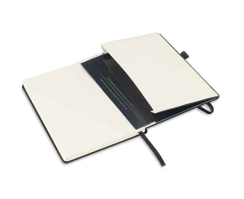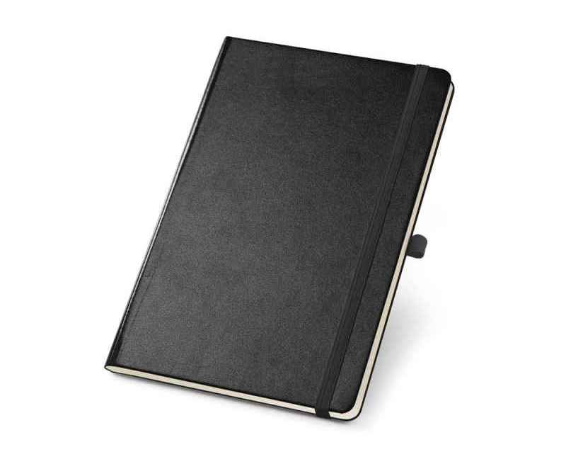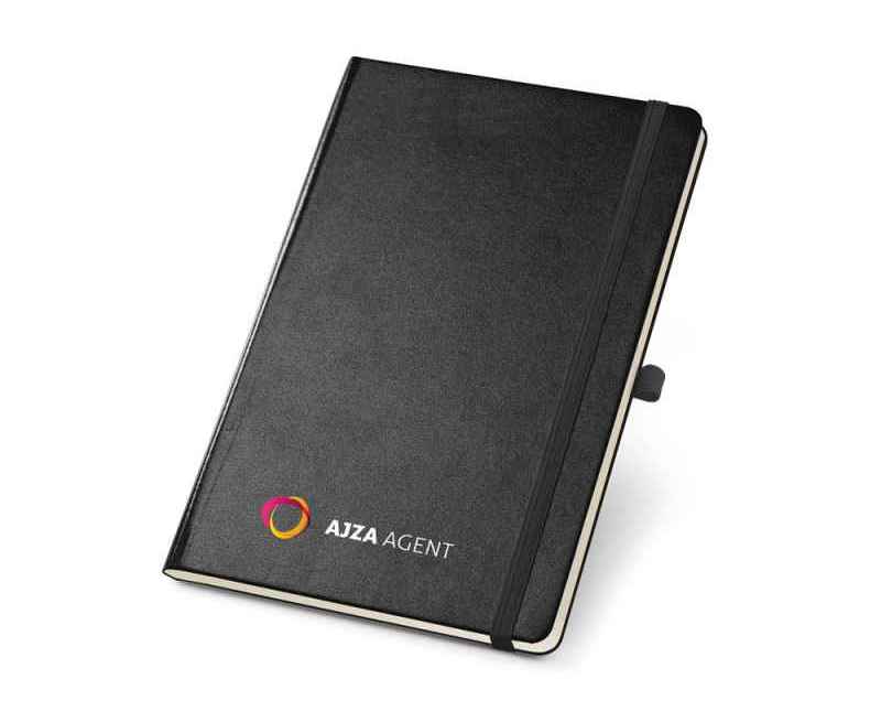 Блокнот формата A5 на 160 чистых страниц цвета слоновой кости, твердая обложка, внутренний карман, разделительная лента, резинка и имеет держатель для шариковой ручки (ручка в комплекте).