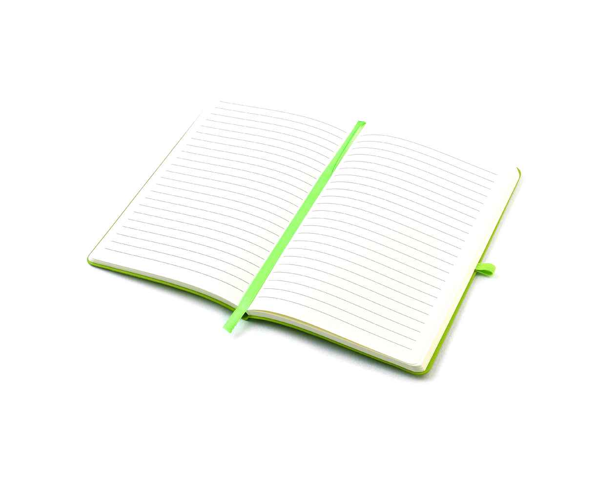 Блокнот формата А5 с мягким покрытием из PU-материала с имитацией рисунка кожи, с эластичной застежкой и текстильной закладкой, наличие петли для ручки в цвет блокнота, 192 страницы, плотность 70г/м, страницы с черными линиями. Цвет по PANTONE® (максимально приближен): 368C.