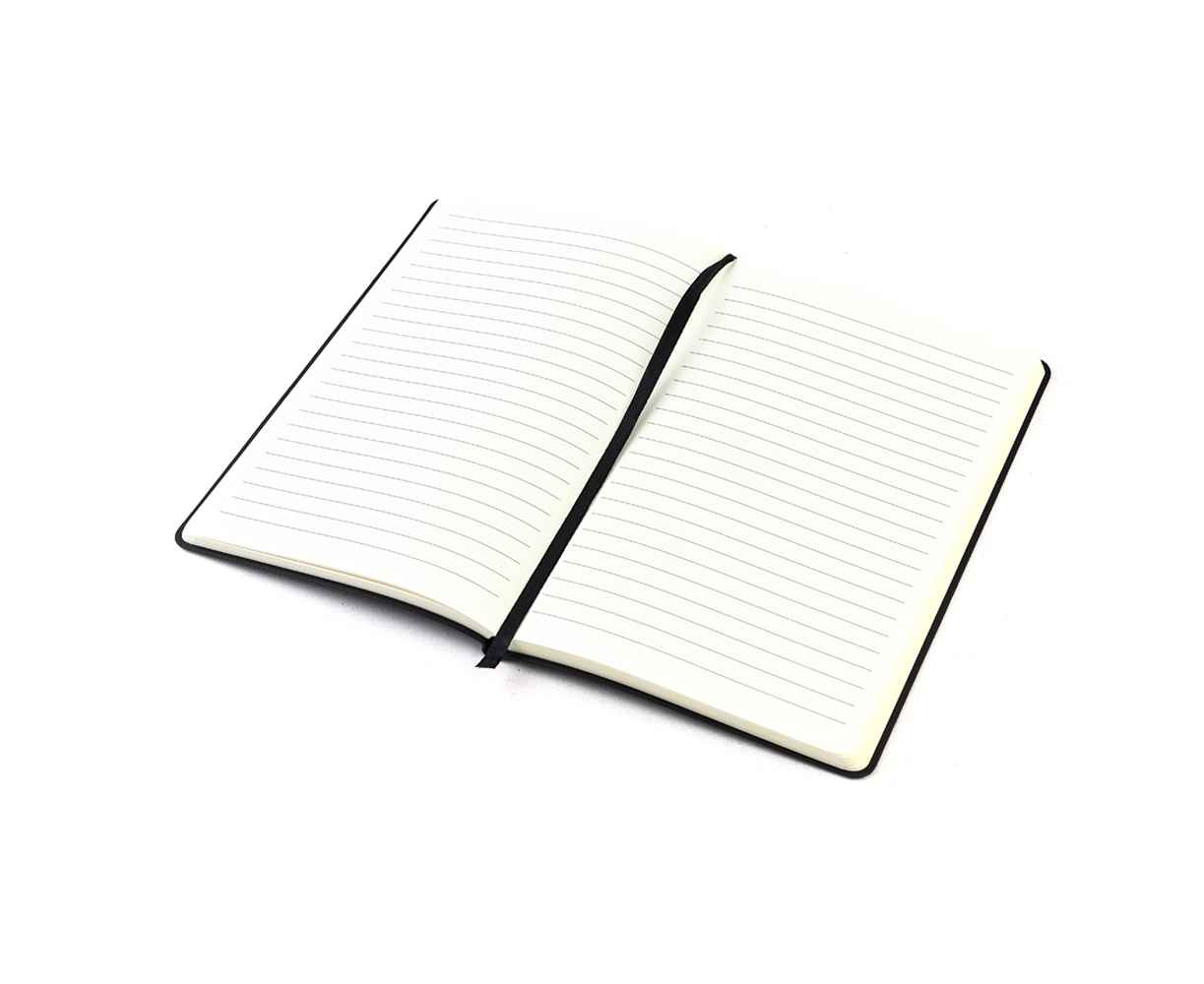 Блокнот формата А5 с мягкой обложкой из PU-материала, имеющего текстуру, имитирующую поверхность натуральной кожи; с текстильной закладкой в цвет блокнота, 256 страниц, плотность 70г/м, страницы с черными линиями.
