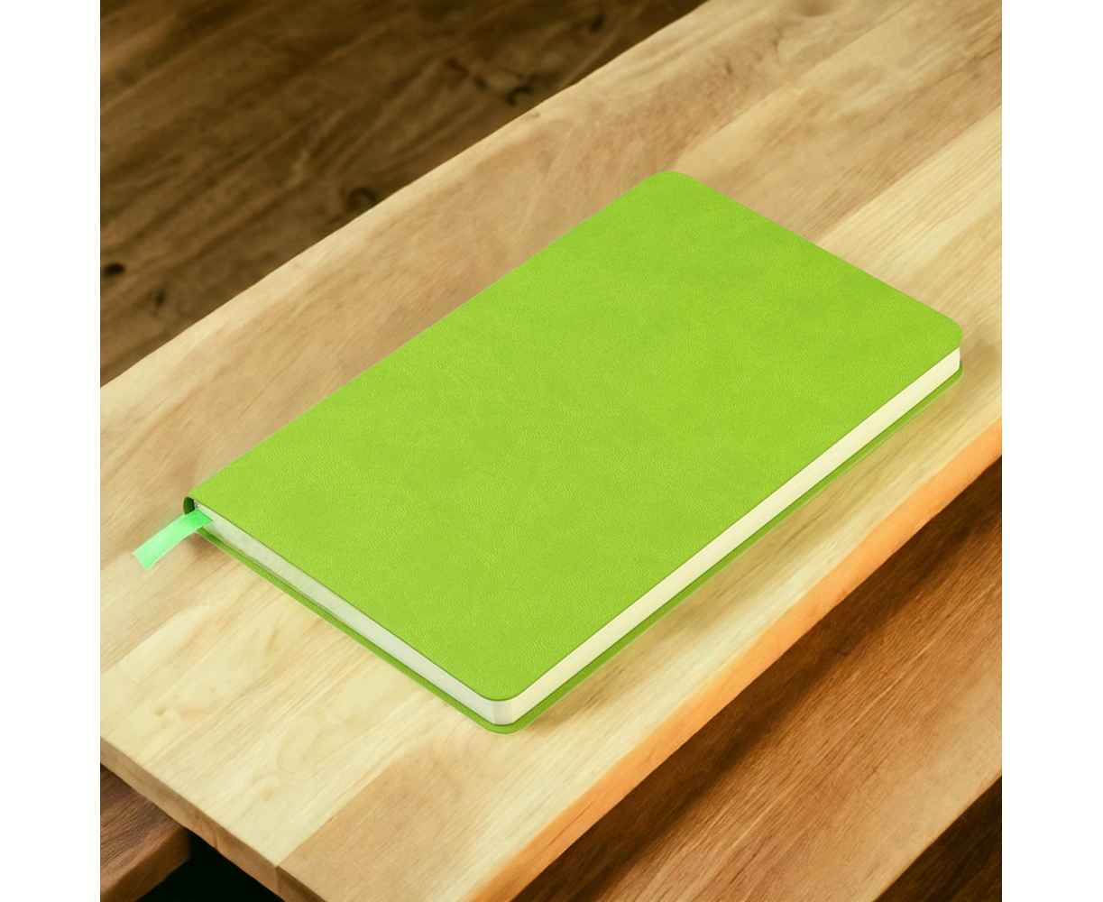 Блокнот формата А5 с мягкой обложкой из PU-материала, имеющего текстуру, имитирующую поверхность натуральной кожи; с текстильной закладкой в цвет блокнота, 256 страниц, плотность 70г/м, страницы с черными линиями. Цвет по PANTONE® (максимально приближен): 368C.