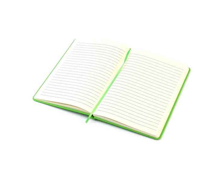 Блокнот формата А5 с твердым покрытием из PU-материала с имитацией рисунка кожи, с эластичной застежкой для закрытия и текстильной закладкой в цвет блокнота, 192 страницы / 96 листов, плотность 70г/м, страницы с черными линиями. Цвет по PANTONE® (максимально приближен): 3501C.
