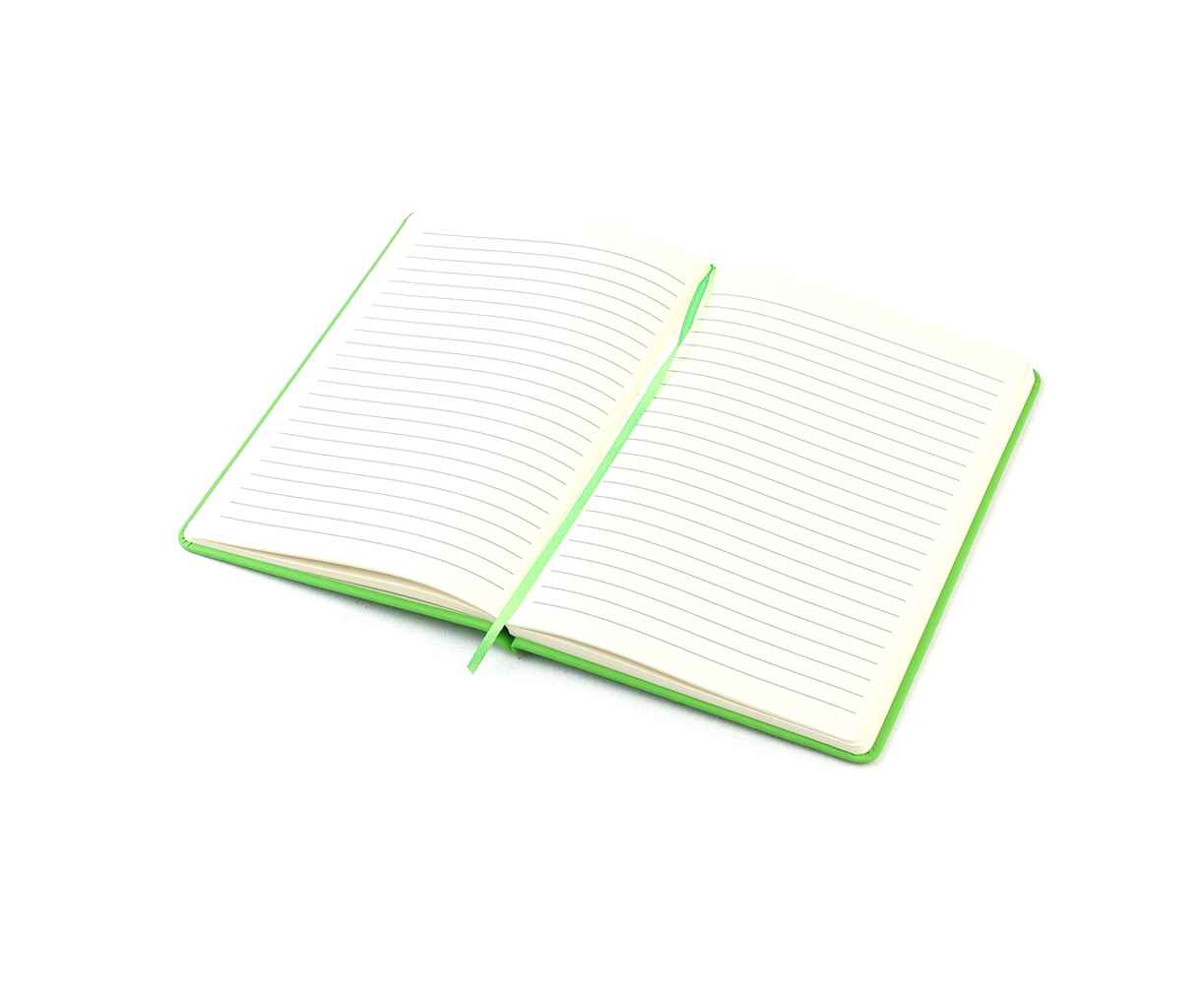 Блокнот формата А5 с твердым покрытием из PU-материала с имитацией рисунка кожи, с эластичной застежкой для закрытия и текстильной закладкой в цвет блокнота, 192 страницы, плотность 70г/м, страницы с черными линиями. Цвет по PANTONE® (максимально приближен): 368C.