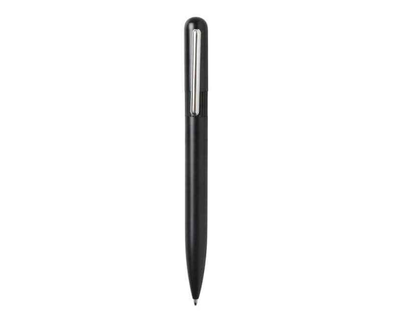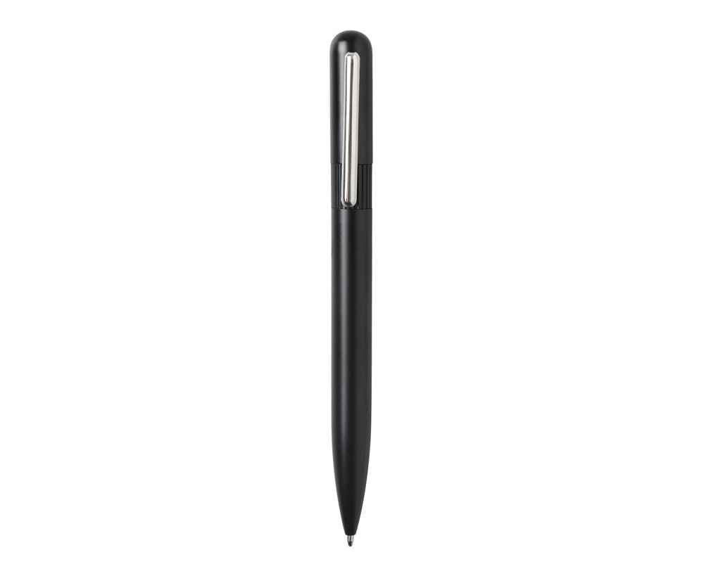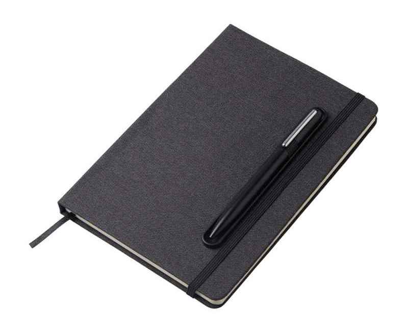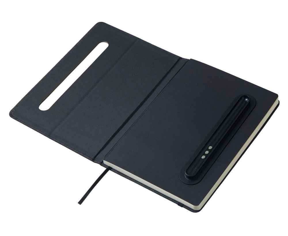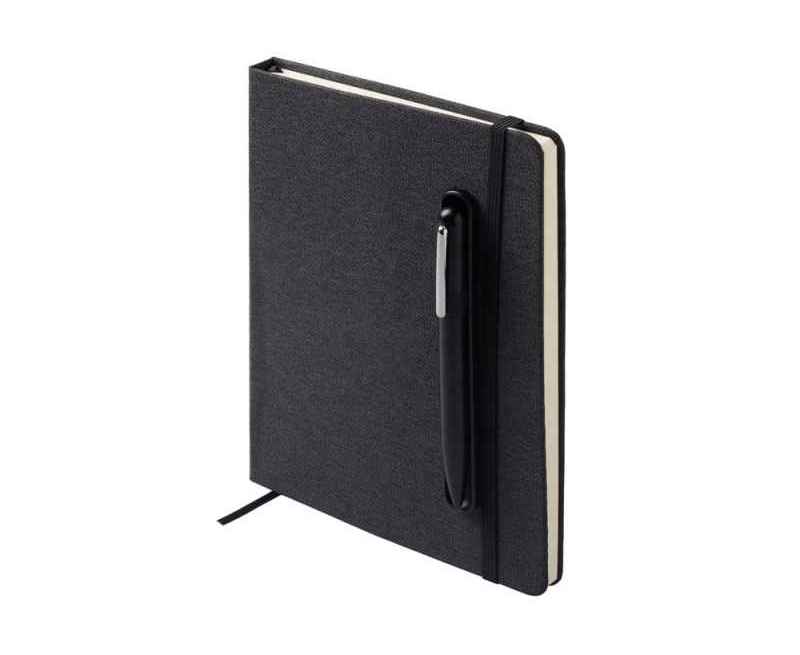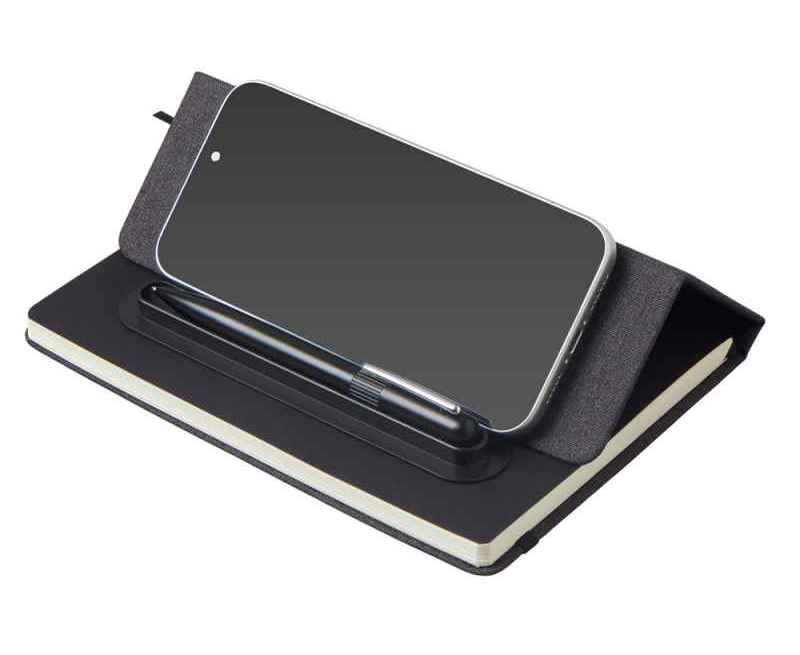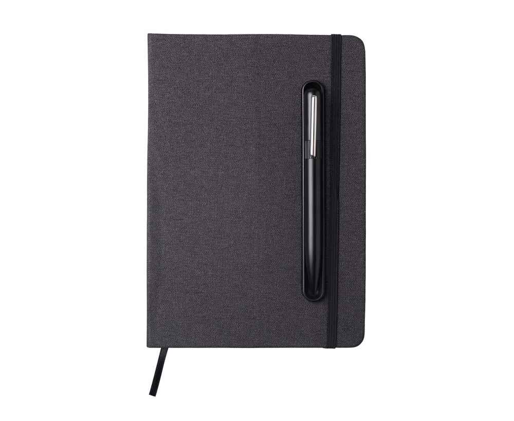 Блокнот в твердой обложке из rpet-пластика с металлической шариковой ручкой. В обложке магнитный держатель для ручки. Также верхняя часть обложки трансформируется в подставку для телефона.
