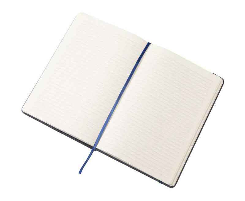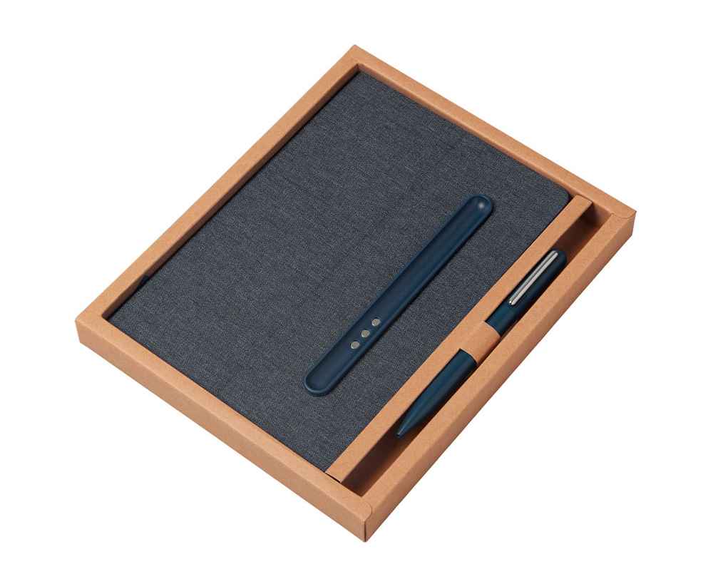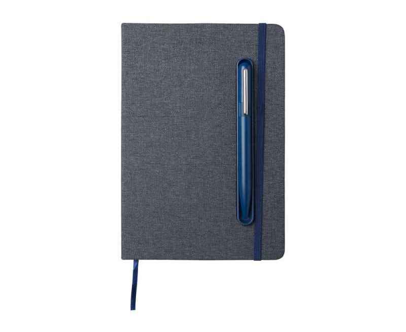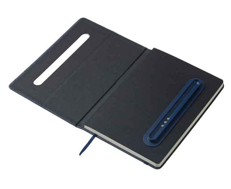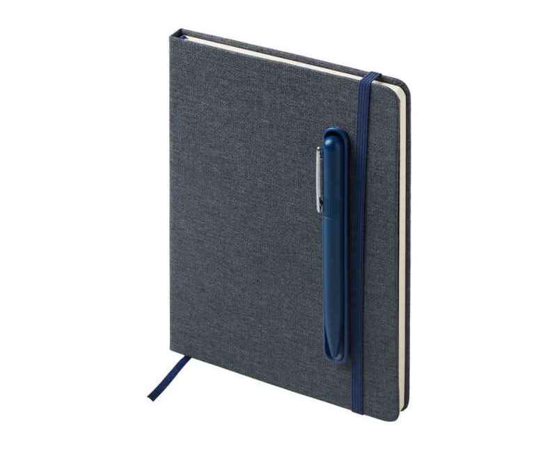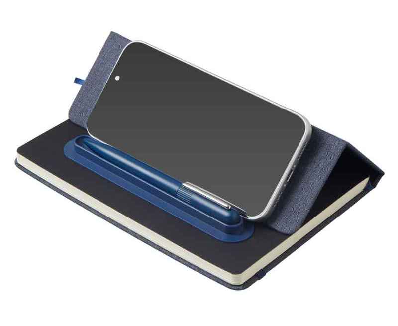 Блокнот в твердой обложке из rpet-пластика с металлической шариковой ручкой. В обложке магнитный держатель для ручки. Также верхняя часть обложки трансформируется в подставку для телефона.