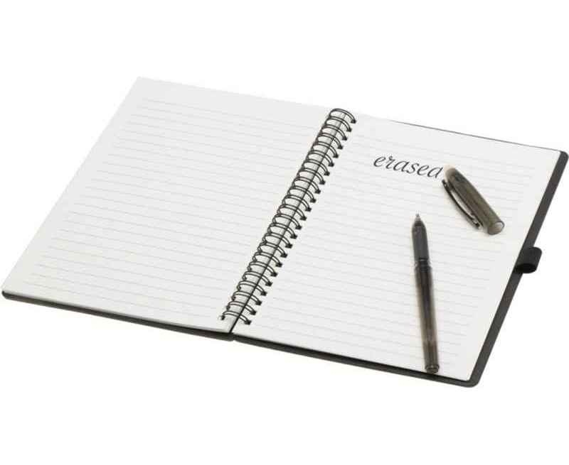 Многоразовый набор из ручки и блокнота в мягкой обложке из каменной бумаги. Блокнот имеет обложку из картона, закругленные углы и 32 листа линованной бумаги плотностью 120 г/м². В производстве каменной бумаги не используется дерево, а на сам процесс изготовления затрачивается гораздо меньше энергии в сравнении с производством переработанной или целлюлозной бумаги. Сзади имеется карман для хранения черной протирочной ткани (входит в комплект). Ручка из переработанного пластика с стираемыми чернилами, прозрачным корпусом, белым ластиком сверху и однотонной цветной рукояткой. Цвет чернил: черный. Длина непрерывной линии: 250 метров. Размер пера: 0,7 мм.
