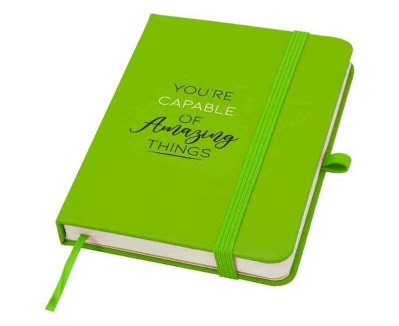 Блокнот Spectrum Plus формата А6 в твердой обложке с закругленными углами — это не только необходимая вещь в офисе, но и прекрасная возможность для продвижения вашего бренда. Картонный блокнот имеет мягкую на ощупь обложку и 80 линованных листов кремового цвета плотностью 70 г/м², идеально подходит для записи быстрых идей или длинных заметок. Блокнот оснащен петлей для ручки, эластичной застежкой, ленточкой-закладкой и карманом-гармошкой.
