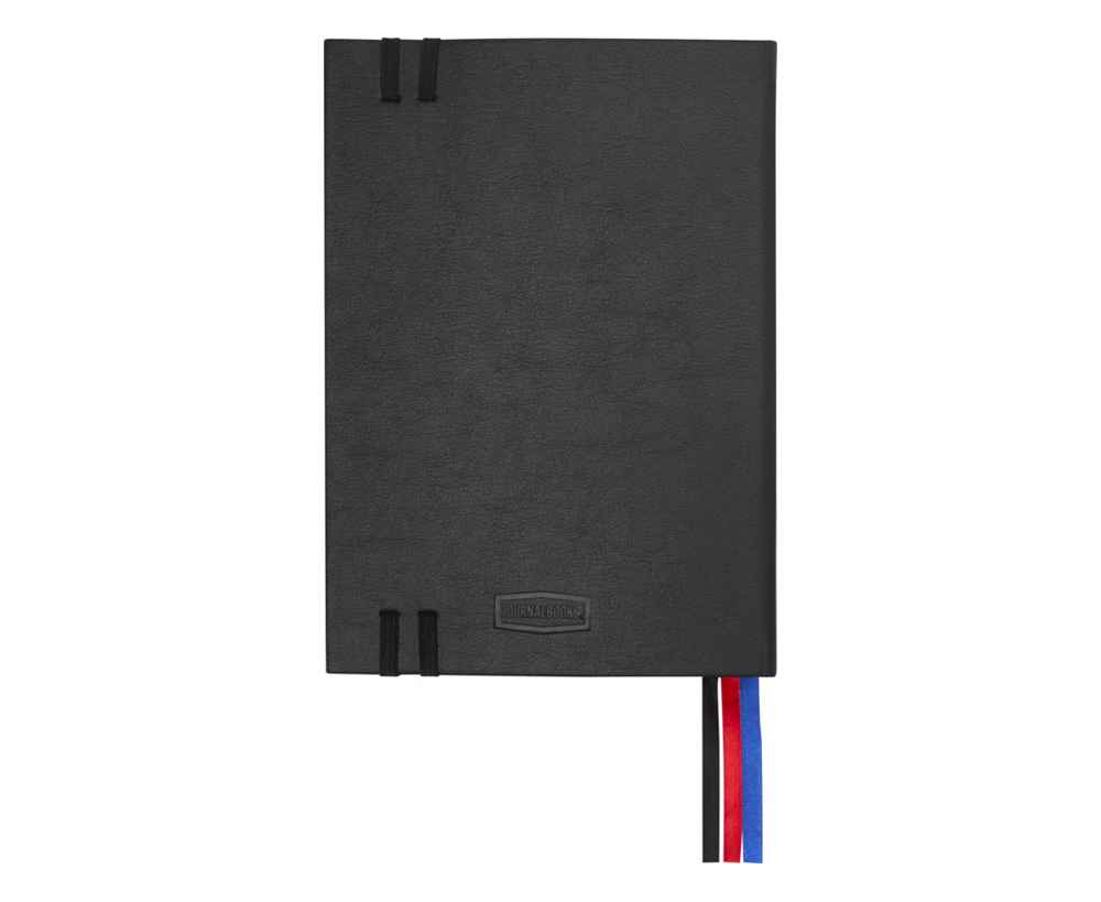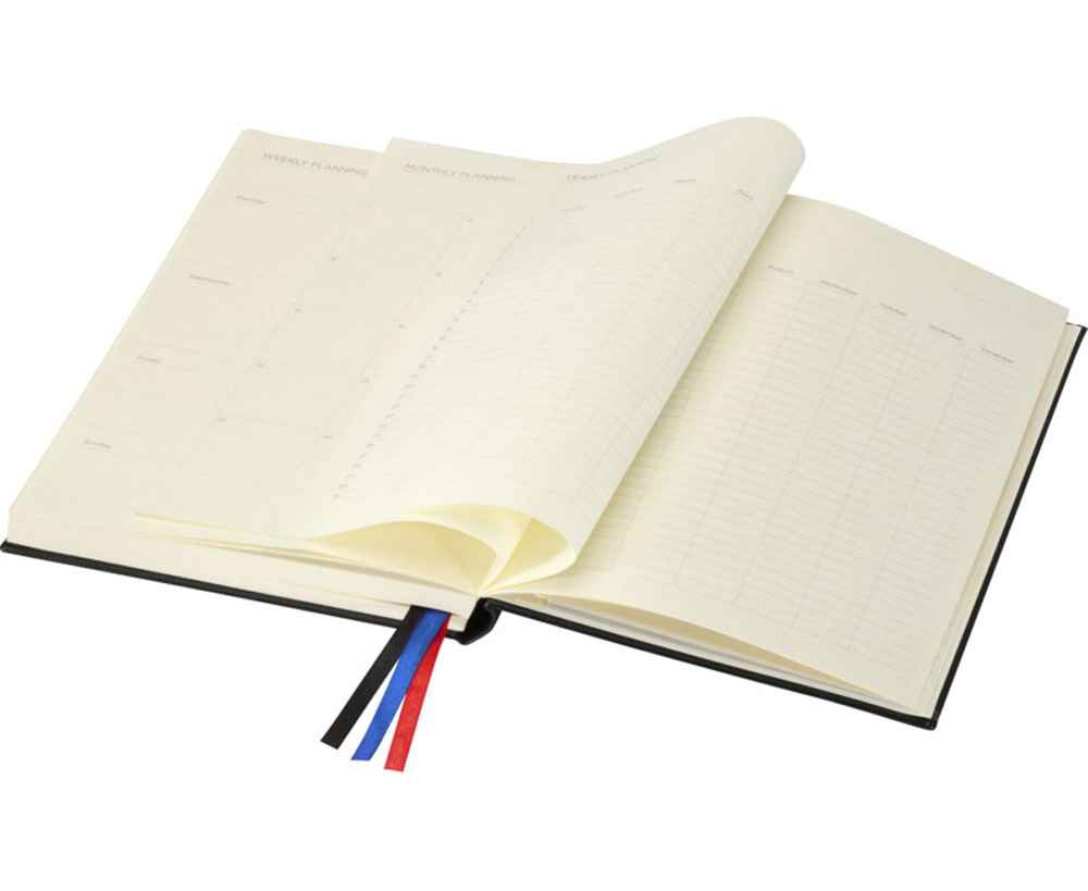Блокнот Alder формата A5 изготовлен из переработанного пластика, имитирующего кожу, и имеет 192 листа из кремовой бумаги плотностью 80 г/м², оформленные в виде планировщика, идеально подходящего для ведения дневника и поддержания порядка в течение всего года. Имеет две эластичные резинки, три ленточные закладки (черная, красная и синяя), 200 разноцветных липких заметок (по 40 каждого цвета) и удобный бумажный кармашек для отдельных заметок. На задней обложке тиснением нанесен логотип JournalBooks, упакован в картонный слив-бокс белого цвета.