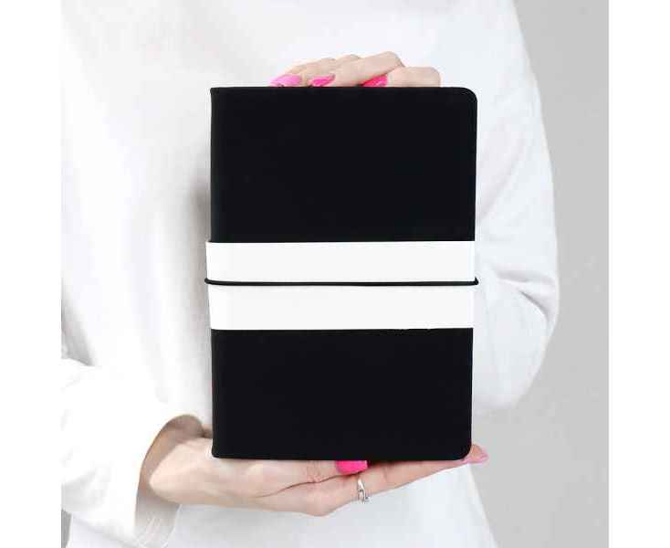 Блокнот А5-формата жёсткой обложке со специальным гладким покрытием. Материал обложки — полиуретан. Карман в нахзаце, форзац, двойное ляссе, эластичная застёжка — всё комплиментарно цвету обложки.