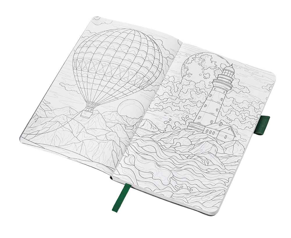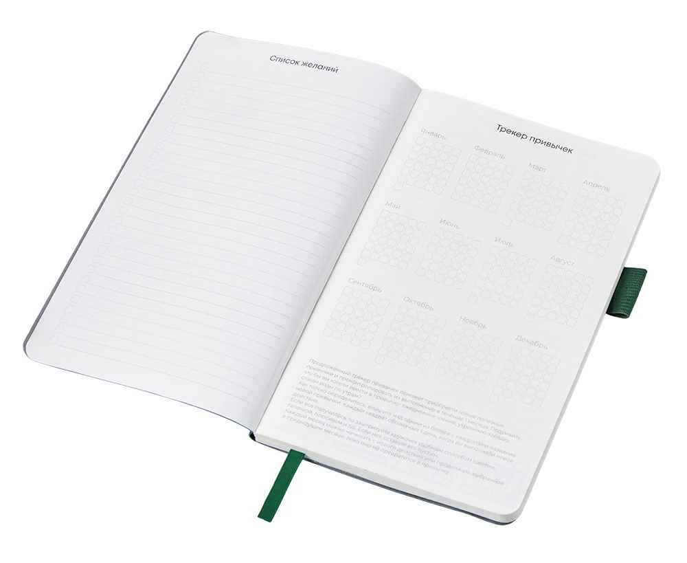 Необычный для блокнота вводный блок включает трекер привычек, списки книг и фильмов, а также 4 страницы для раскрашивания с картинками и мандалами.