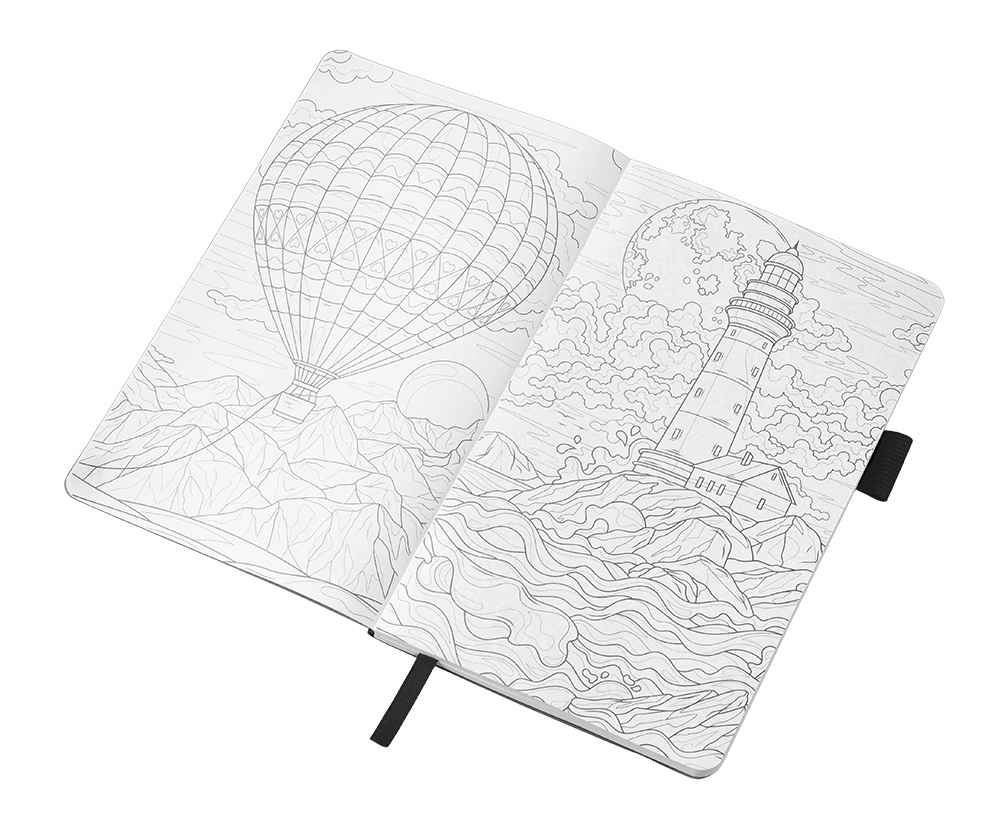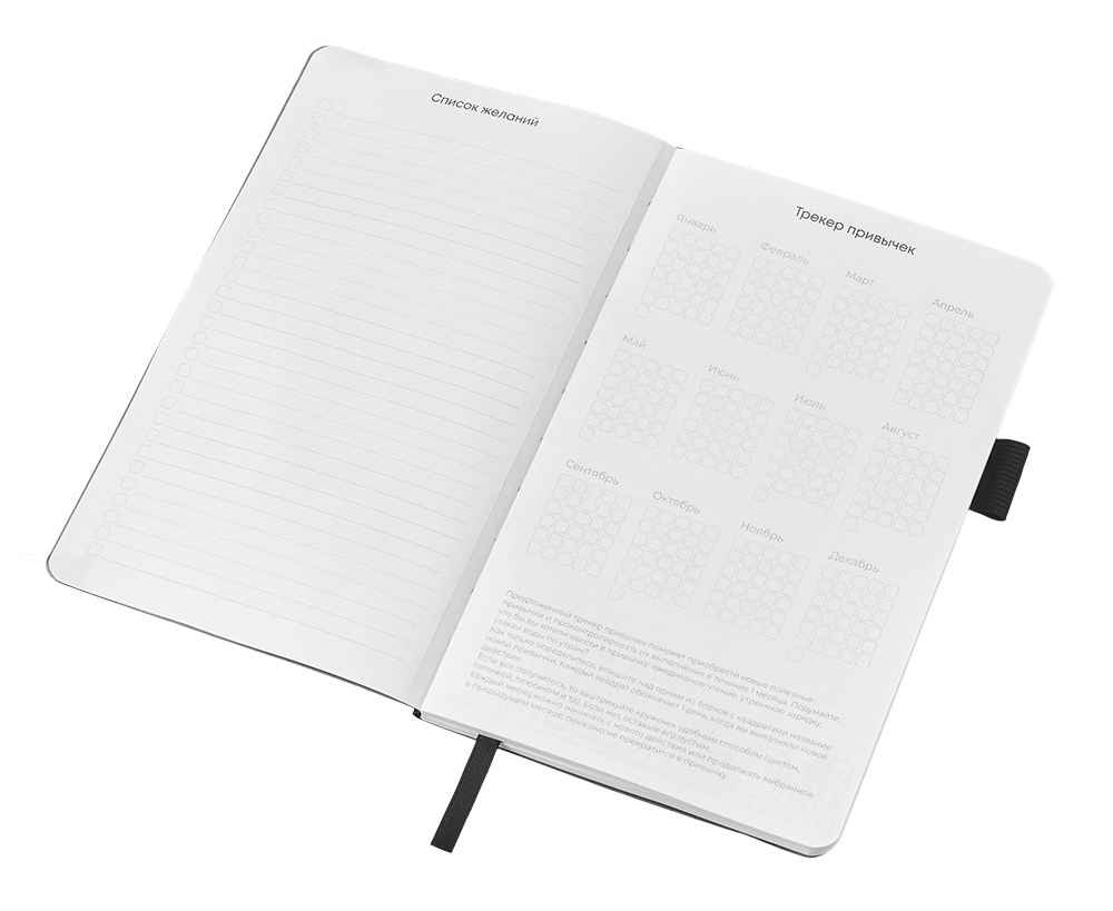 Необычный для блокнота вводный блок включает трекер привычек, списки книг и фильмов, а также 4 страницы для раскрашивания с картинками и мандалами.