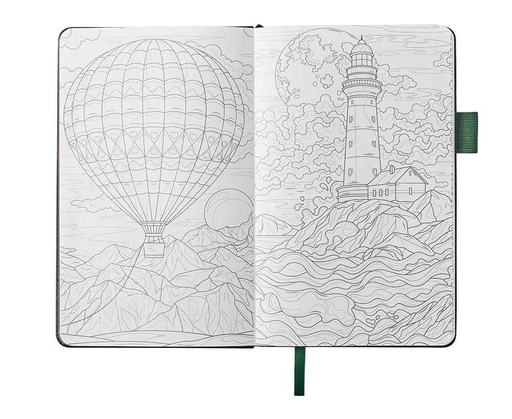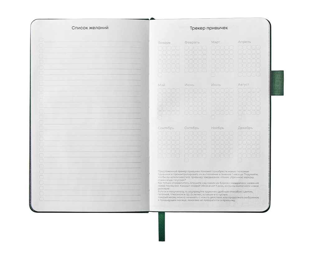 Необычный для блокнота вводный блок включает трекер привычек, списки книг и фильмов, а также 4 страницы для раскрашивания с картинками и мандалами.