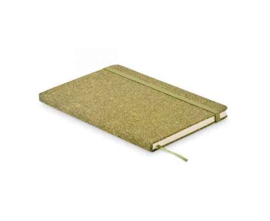 Блокнот А5 в твердой обложке из 20% чайного порошка, 30% пробки и 50% поликоттона. В футляре. 160 линованных страниц из переработанной бумаги (80 листов/70 г/м²). Резинка в цвет блокнота и лента-закладка.