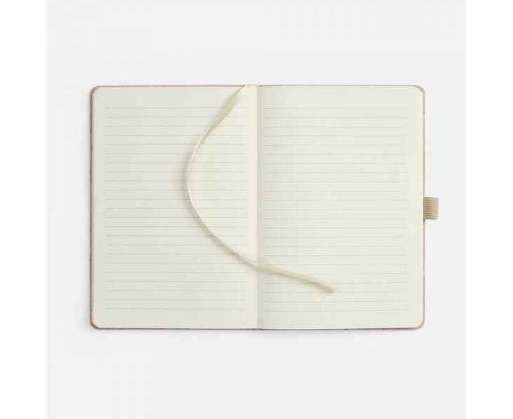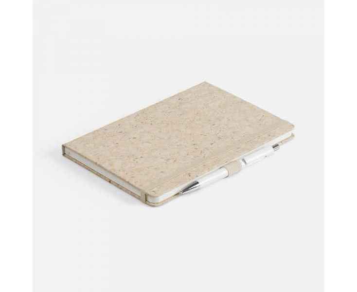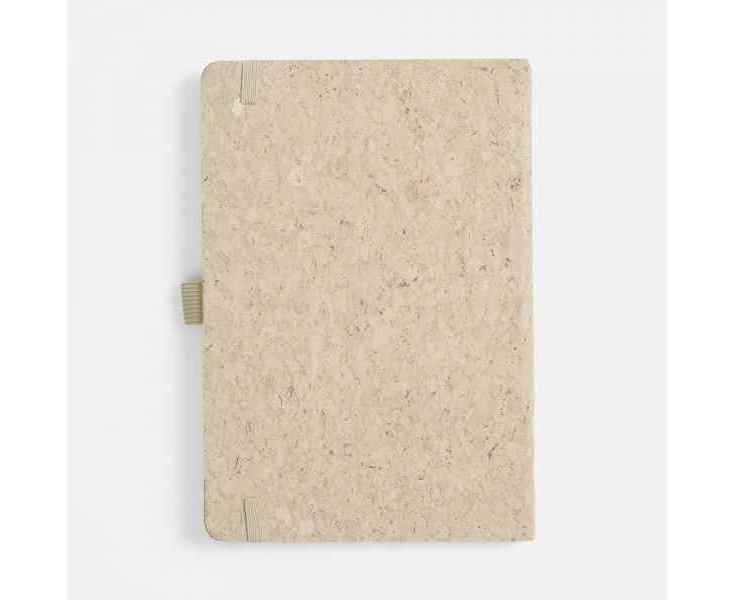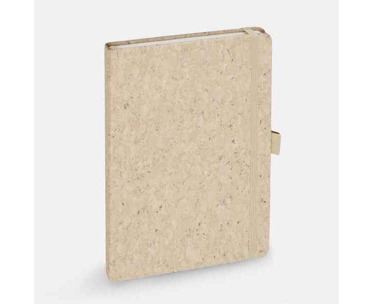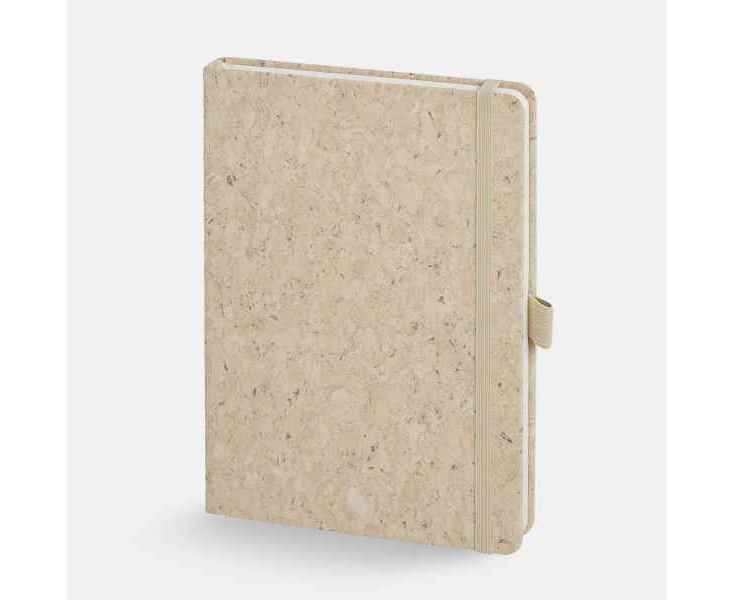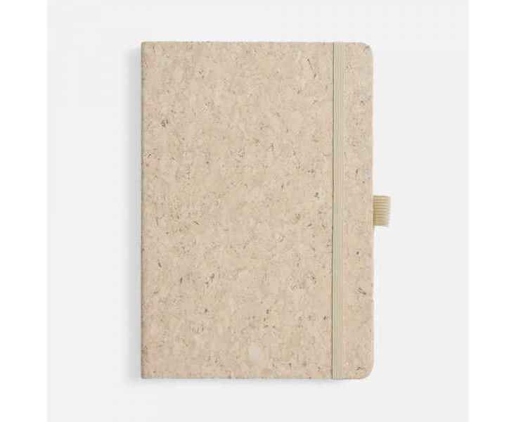 Блокнот с твердой обложкой из натуральной окрашенной пробки, дополнен петлей-резинкой для ручки, ляссе и резинкой в цвет обложки.