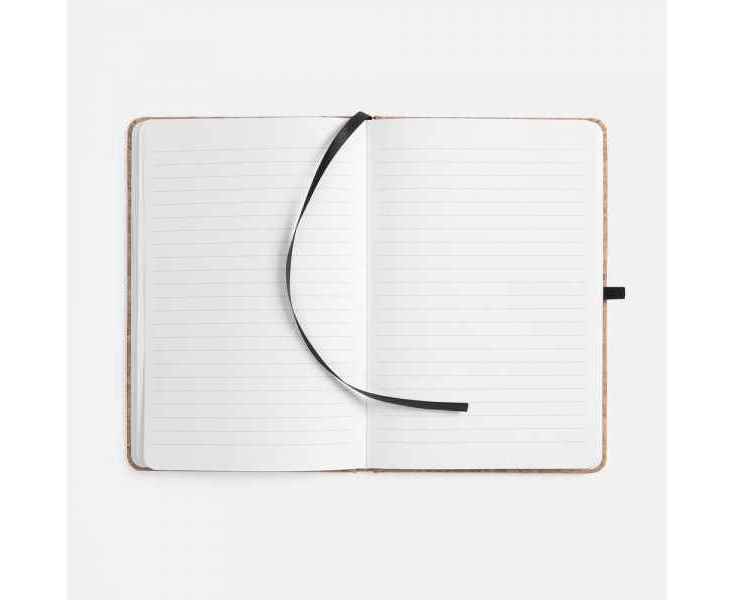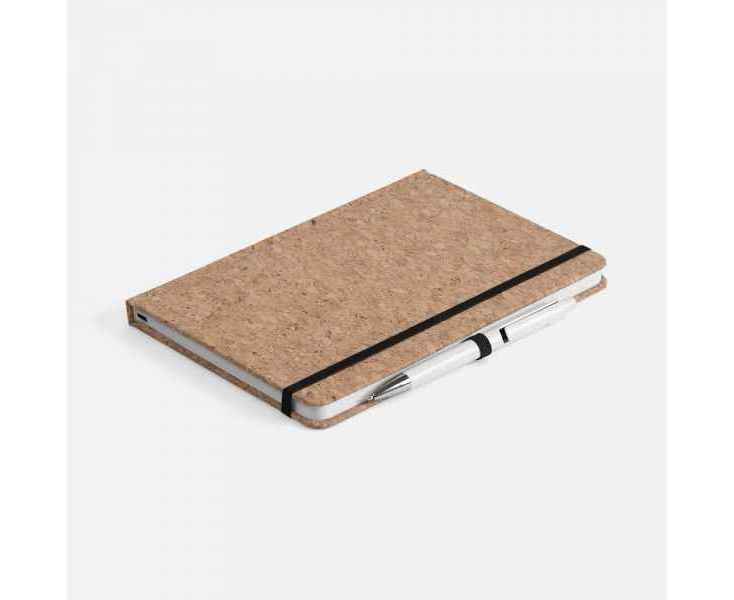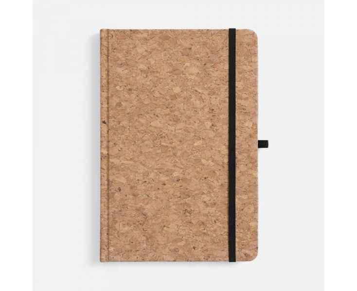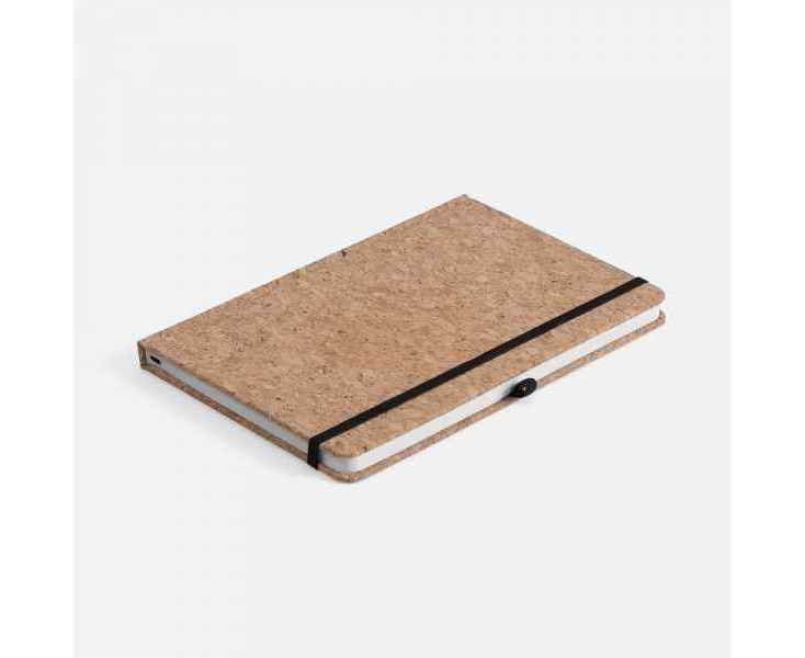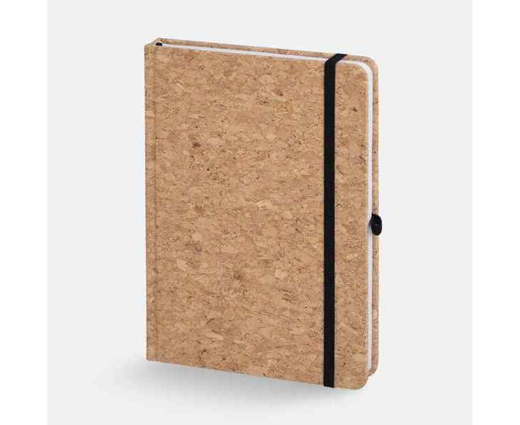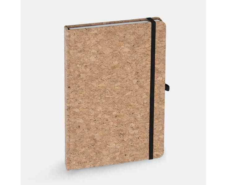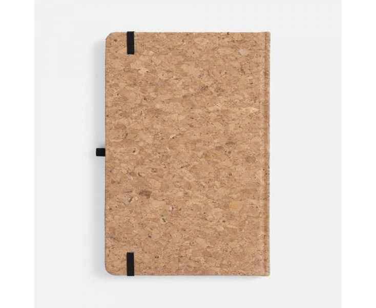 Блокнот в твердой обложке из натуральной неокрашенной пробки, дополнен цветными петлей-резинкой для ручки, ляссе и резинкой на обложку.