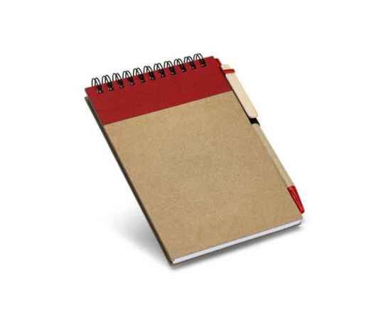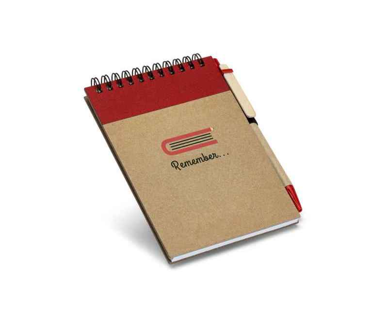 Карманный блокнот на спирали, на 120 страниц из переработанной бумаги и обложкой из твердого картона. Блокнот имеет держатель для шариковой ручки (входит в комплект). 105 x 145 мм. Вид нанесения, рекомендуемый поставщиком: тампопечать, трафаретная печать, трансфер.