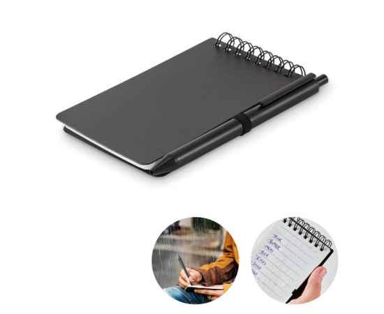 Блокнот в водоотталкивающей обложке из полипропилена с ручкой. Двойная проволока. Минеральная бумага 120 г/м², 50 листов в линейку. Синие чернила. Эластичный ремешок и держатель для ручки.