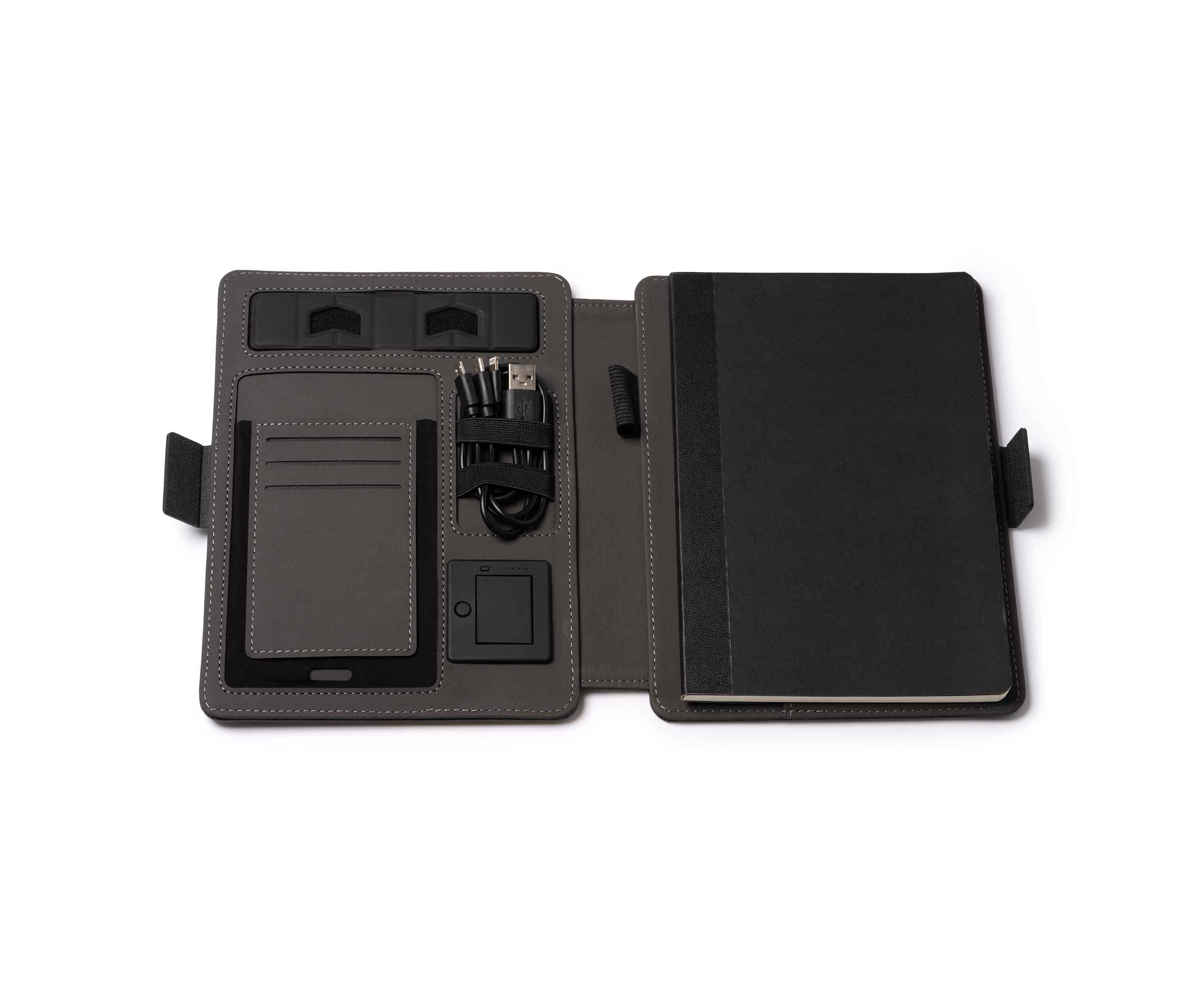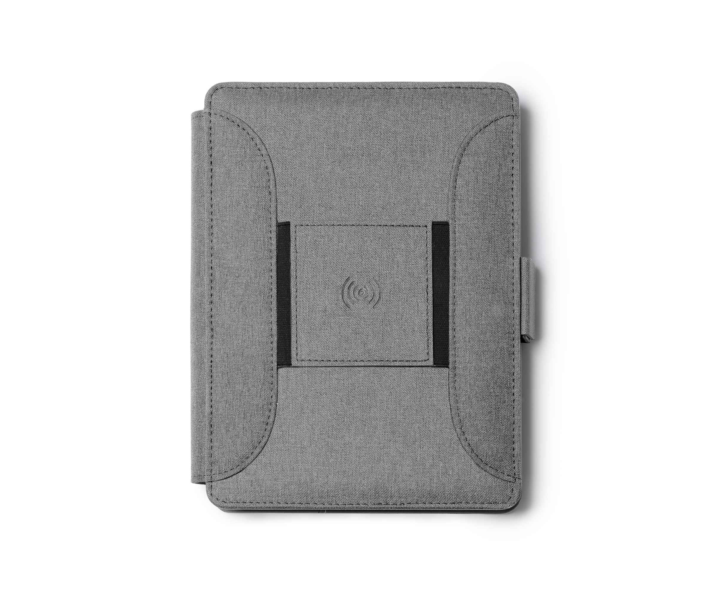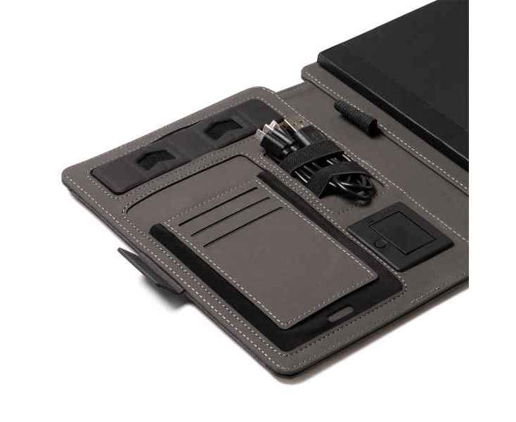 Многофункциональная папка формата А5 RPET 300D — универсальный и практичный аксессуар, позволяющий систематизировать документы. Магнитный замок, беспроводная зарядка, съемный блокнот на 56 листов, кармашек для мобильного, держатель для карт, ручек и мобильного. Кроме того, в комплект входит кабель с 3 входами (тип C и выход USB)
