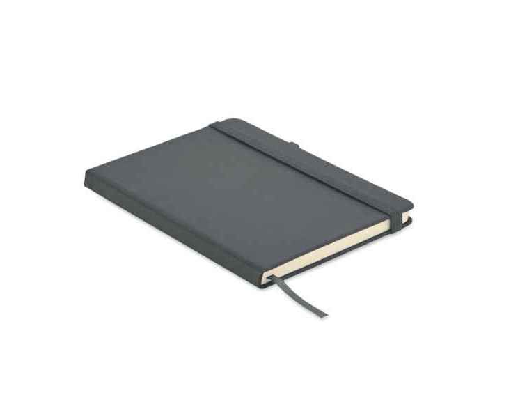 Блокнот формата A5 с обложкой из переработанного полиуретана. Переплет. 192 линованные страницы из переработанной бумаги (96 листов). Эластичный ремешок и крепление для маркеров и ручек.