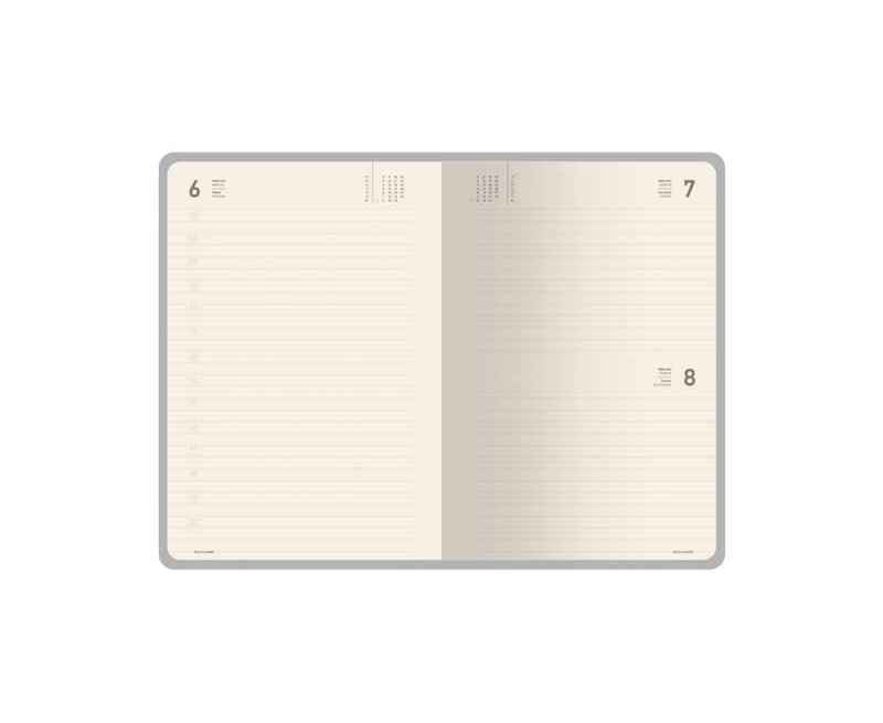Твердая обложка из фактурной искусственной кожи, двойное ляссе и окрашенный обрез придают ему особый шарм. Блок из бежевой бумаги плотностью 70 г/кв.м содержит раздел для планирования, календарь и справочную информацию.