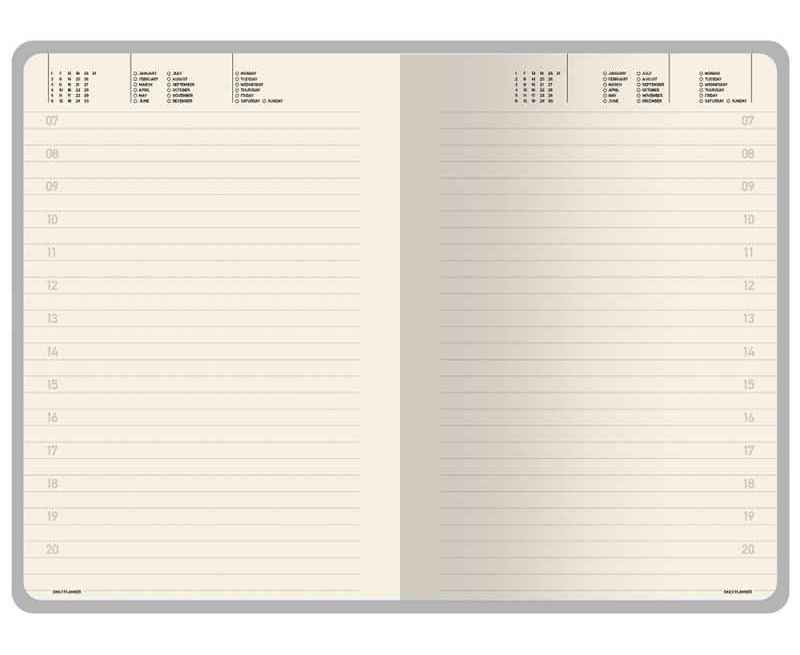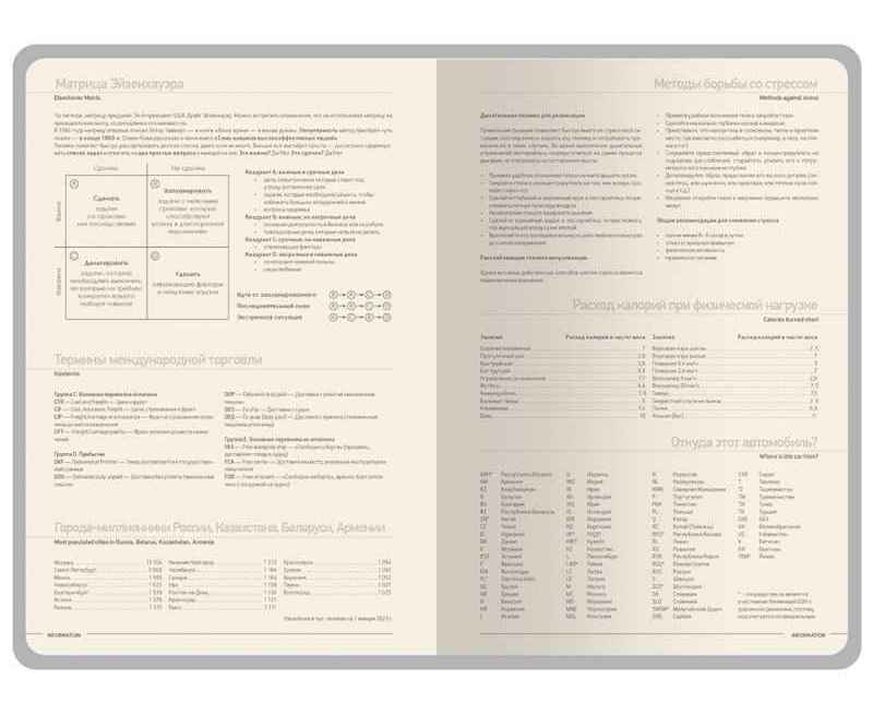 Недатированные страницы в серую линейку имеют отдельное место для проставления числа месяца и дня недели. Справочный блок на 17 страницах содержит полезную информацию из различных областей.