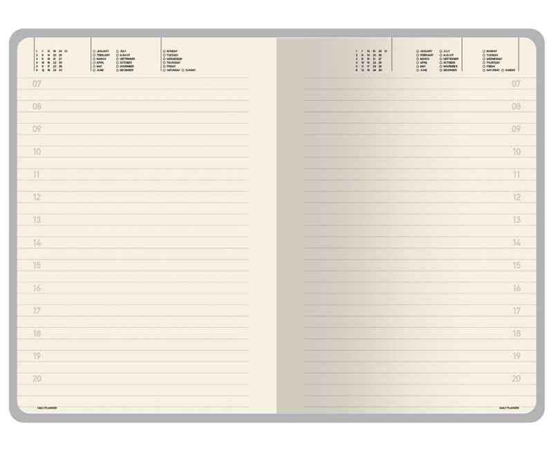 Недатированные страницы в серую линейку имеют отдельное место для проставления числа месяца и дня недели. Справочный блок на 17 страницах содержит полезную информацию из различных областей.