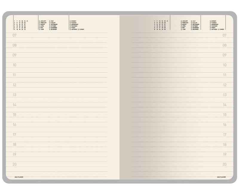Недатированные страницы в серую линейку имеют отдельное место для проставления числа месяца и дня недели. Справочный блок на 17 страницах содержит полезную информацию из различных областей.