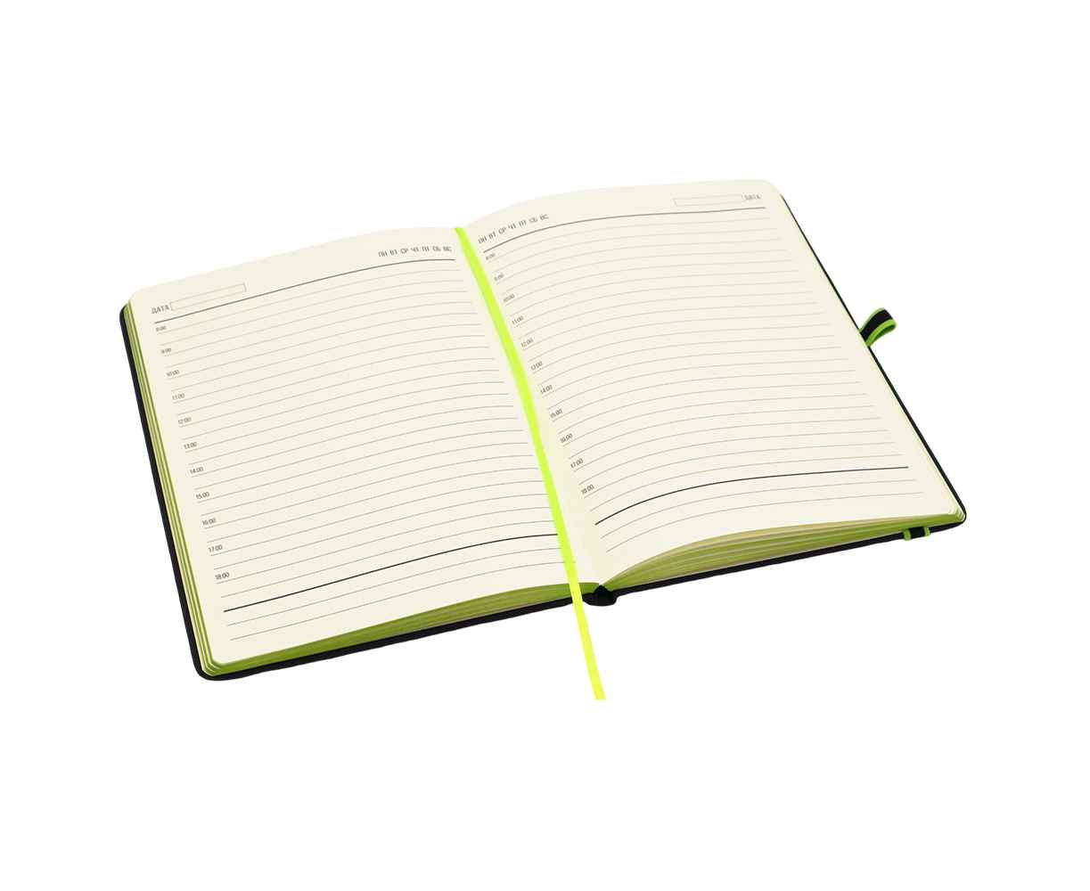 Ежедневник Sir Lewis — выполнен в твердой обложке. Имеет удобную, широкую резинку (1 см.) и держатель для ручки с ярким акцентом. Закладка и край — также в акцентном цвете. В начале ежедневника страничка с личными данными.