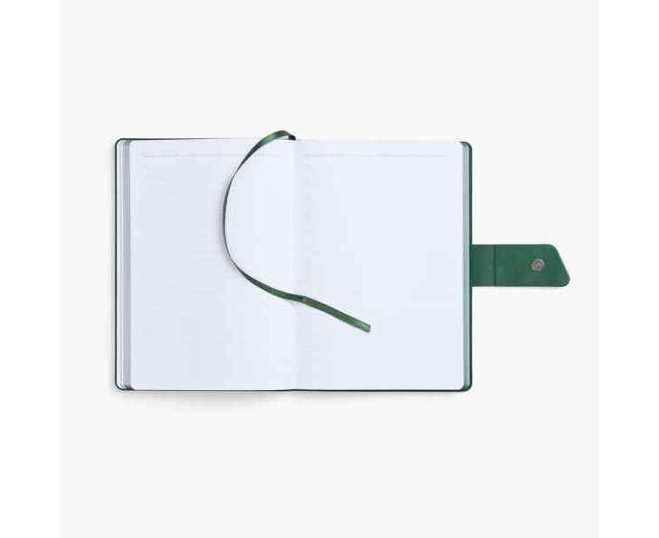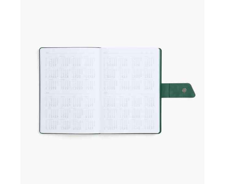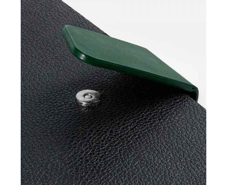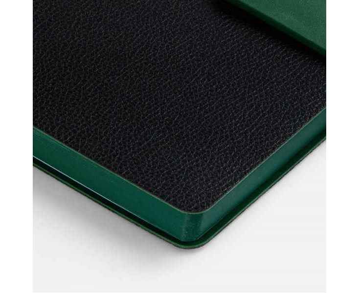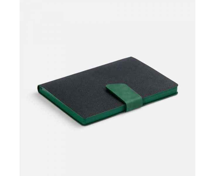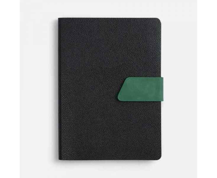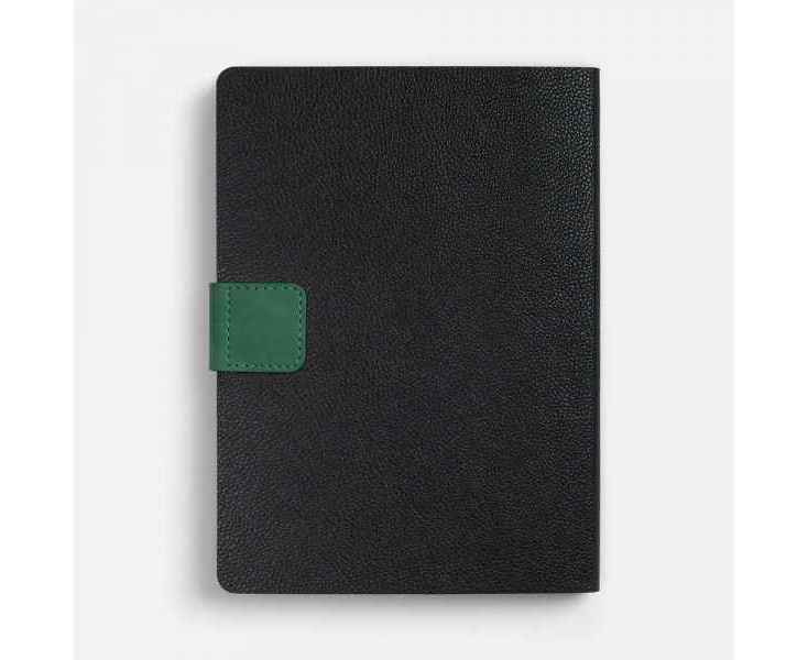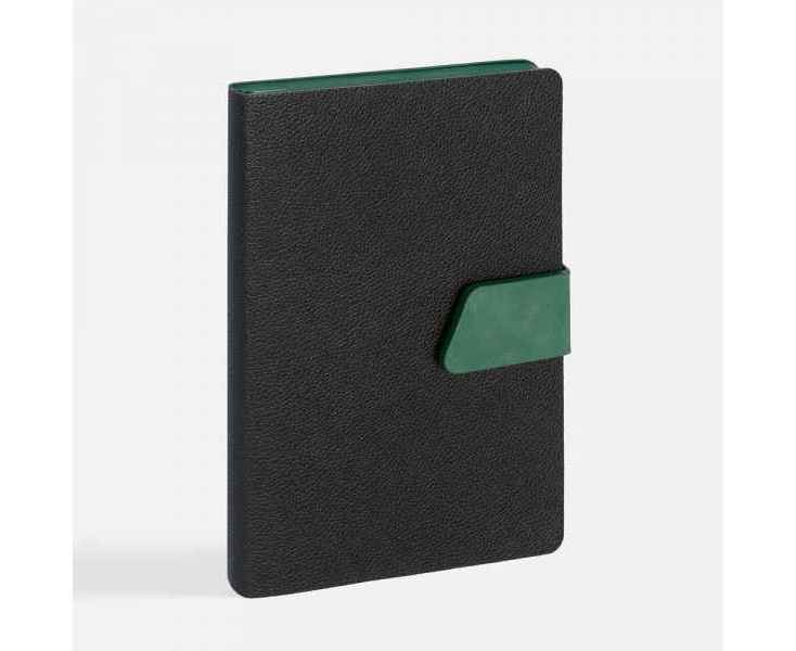 Ежедневник с гибкой обложкой, выполнен из материала La Fite, черный АА и NubuckTouch, зелёный, дополнен зеленым ляссе и хлястиком на кнопке.