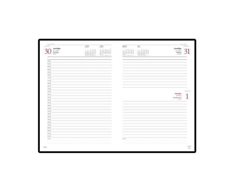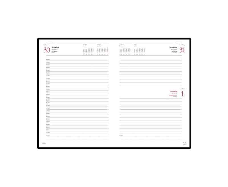 Благородство и статусность придают ежедневнику отстрочка по периметру в тон, скругленные углы, закладка-ляссе бордового цвета, золотой срез.