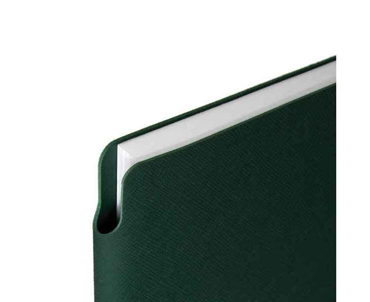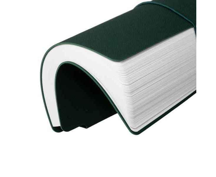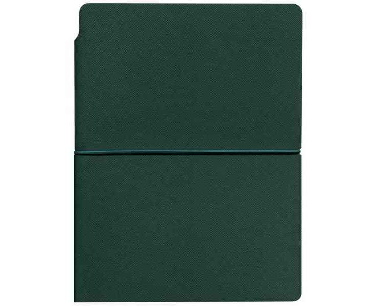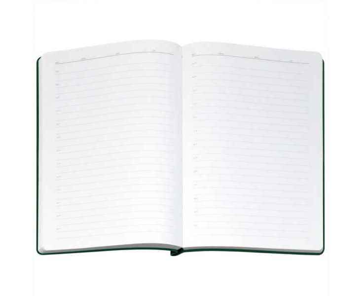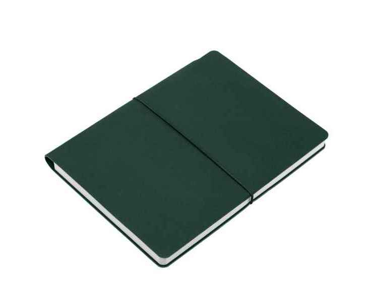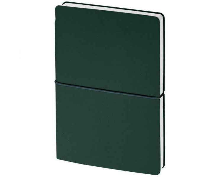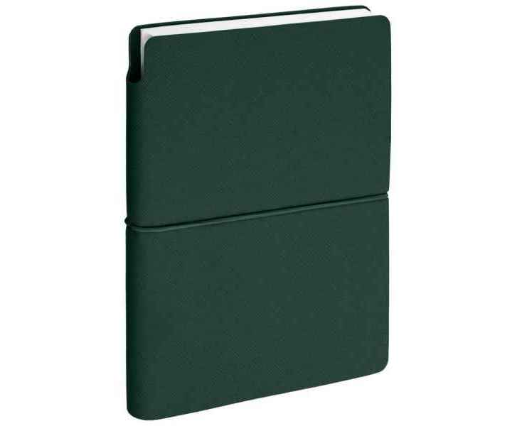 Ежедневник с гибкой обложкой выполнена из материала Nice Touch, зеленый и Latte, зеленый (внутренняя часть обложки), дополнен горизонтальной резинкой в цвет обложки. Внутри корешка — специальное место для крепления ручки размером до 15х1 см.