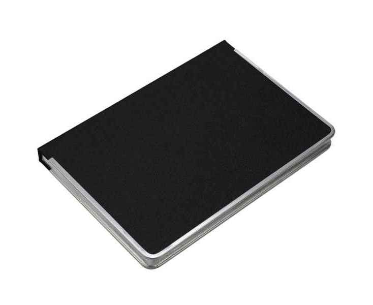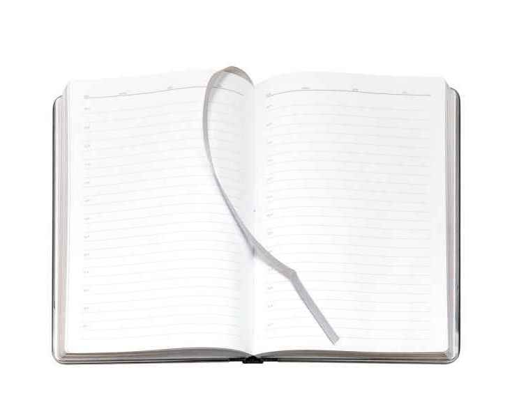 Ежедневник с твердой обложкой и серебристым обрезом, выполнен из материала Saffian, черный, дополнен серым ляссе и металлическими рамками.
