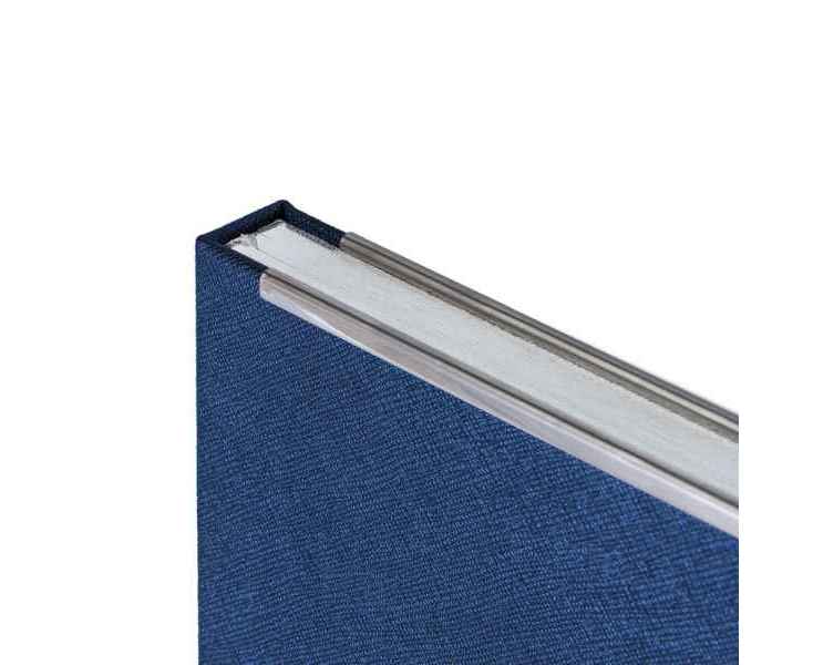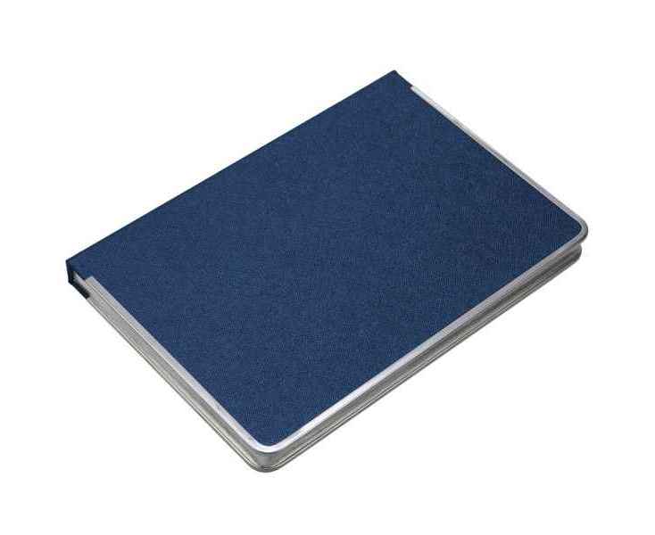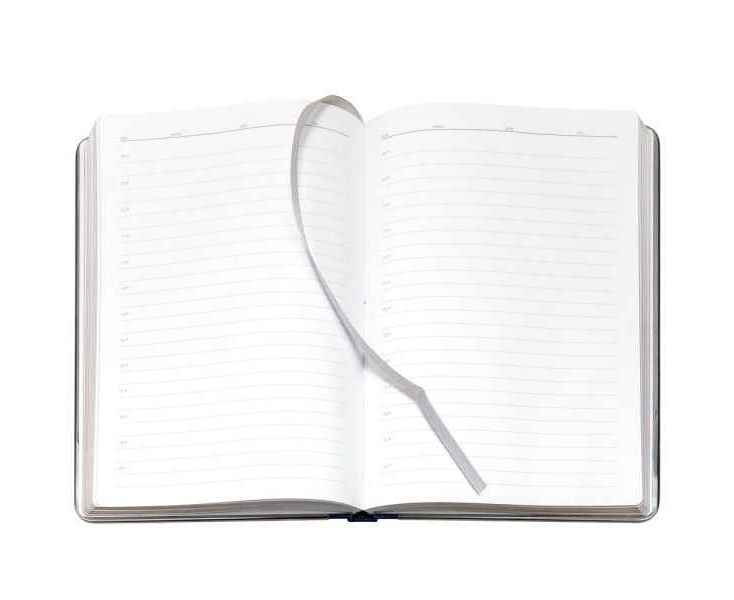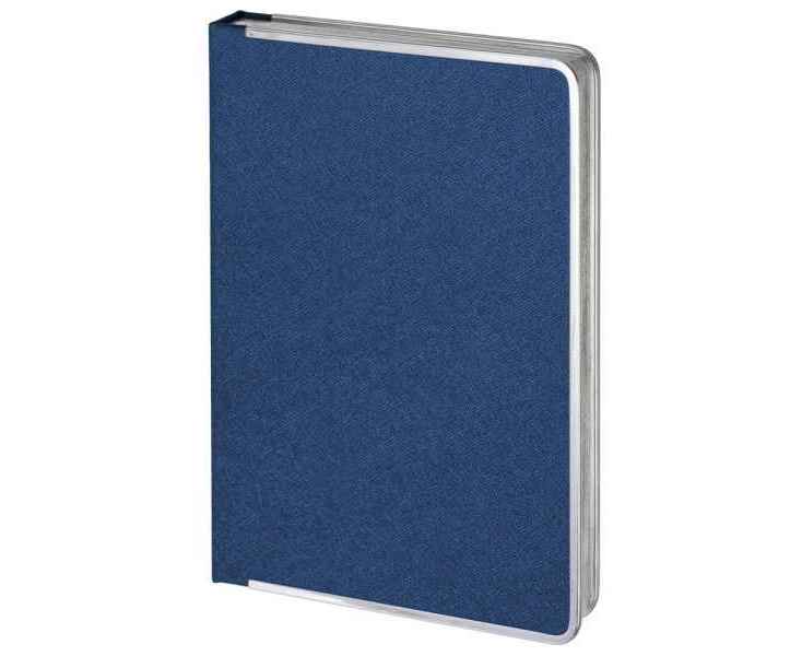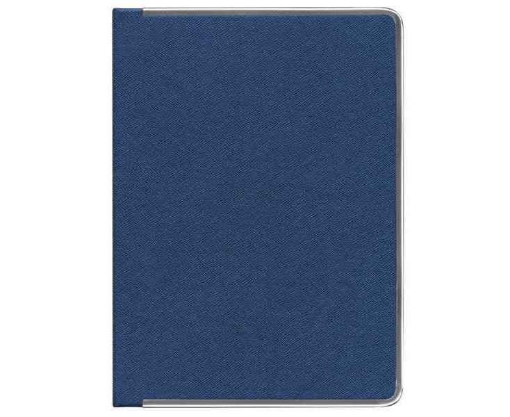 Ежедневник с твердой обложкой и серебристым обрезом, выполнен из материала Saffian, синий, дополнен серым ляссе и металлическими рамками.