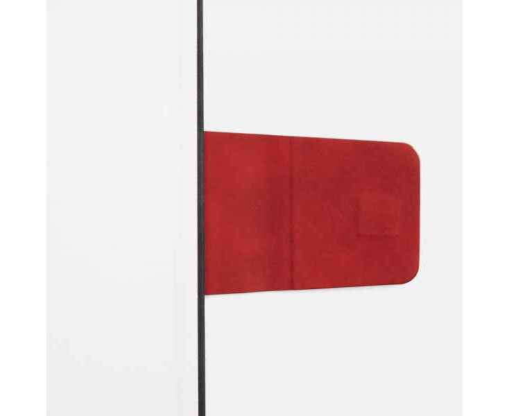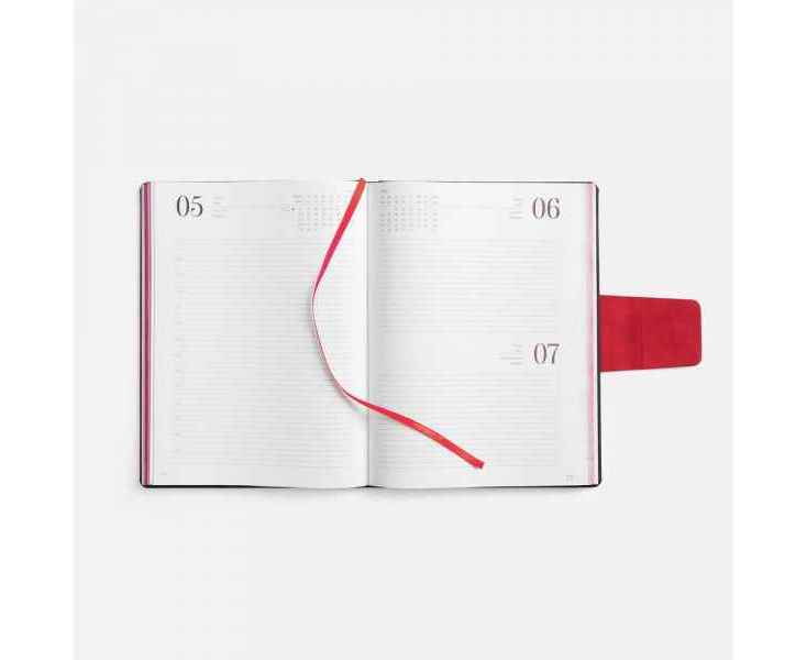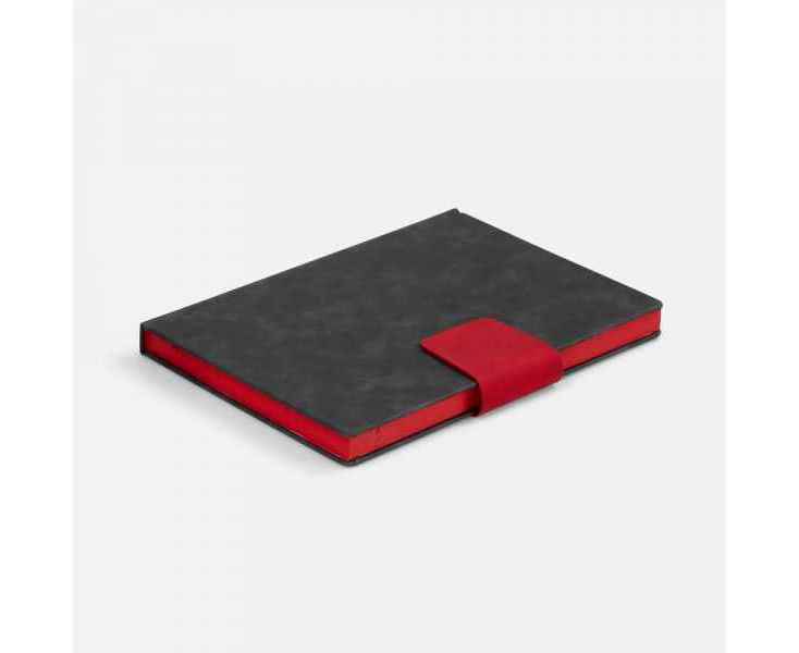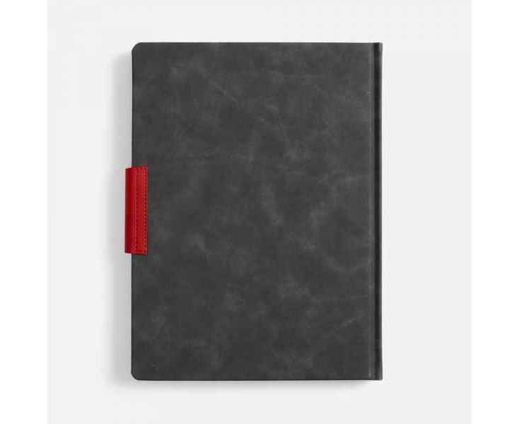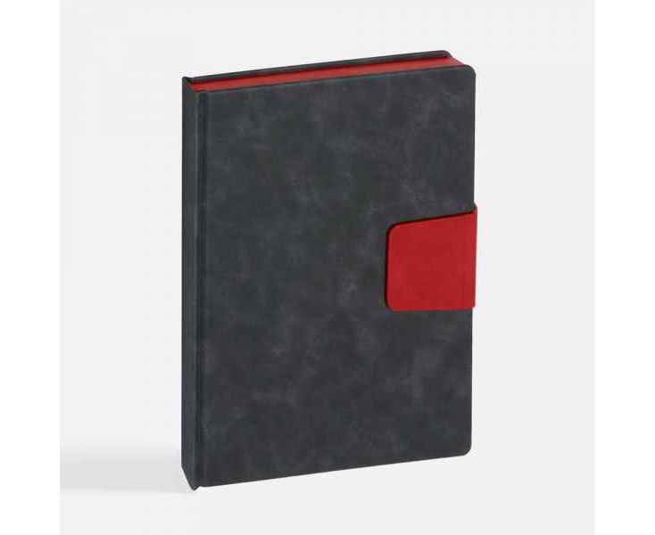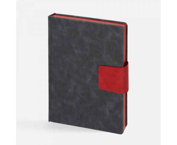 Ежедневник с твердой обложкой, выполнен из материала Nubuck Touch, черный АА, дополнен капталом, ляссе и обрезом красного цвета. Застежка — хлястик на магните из материала Nubuck Touch, красный РР.
