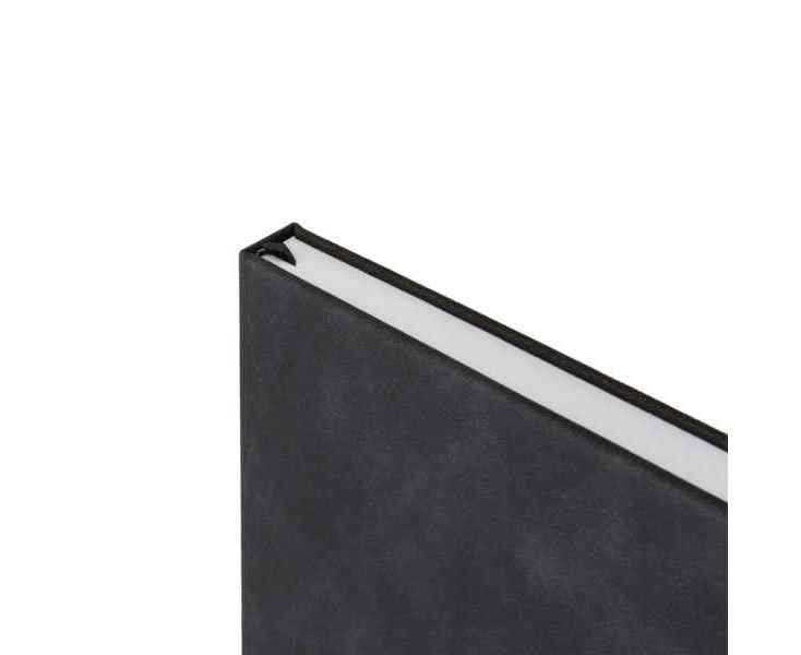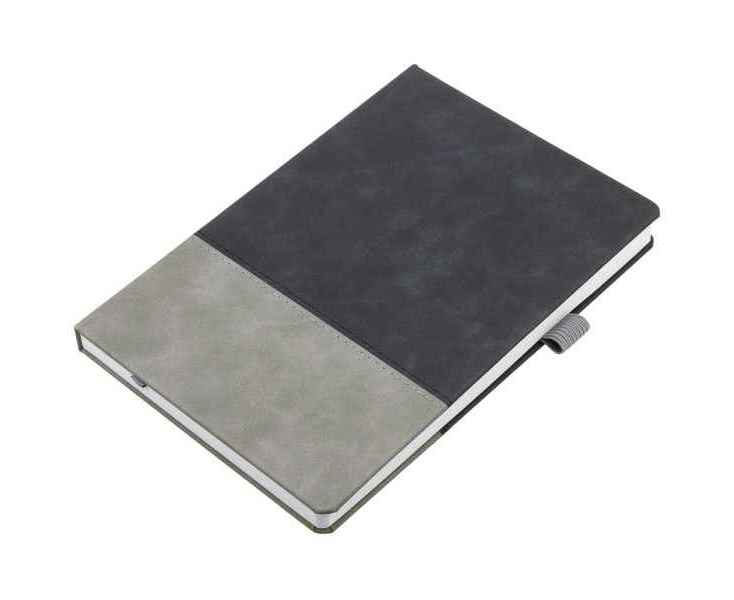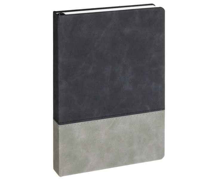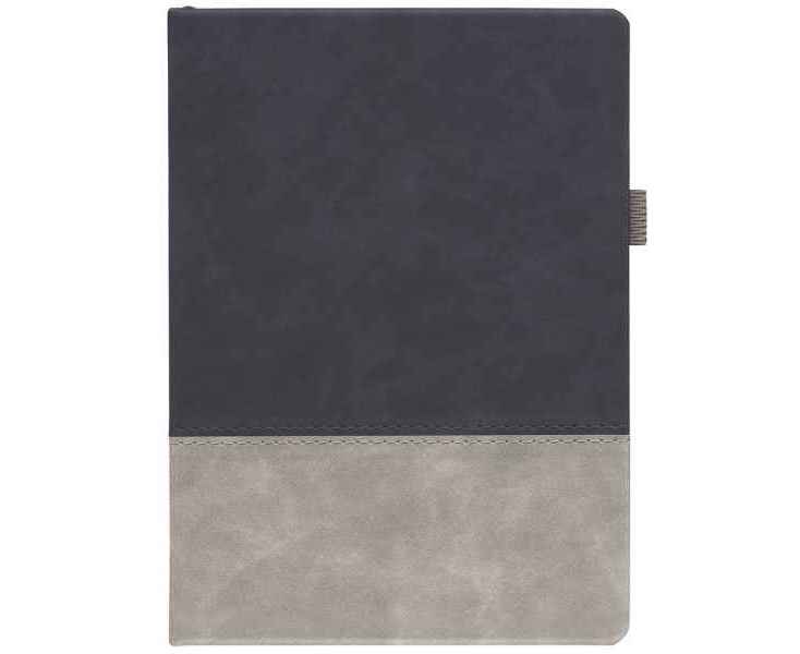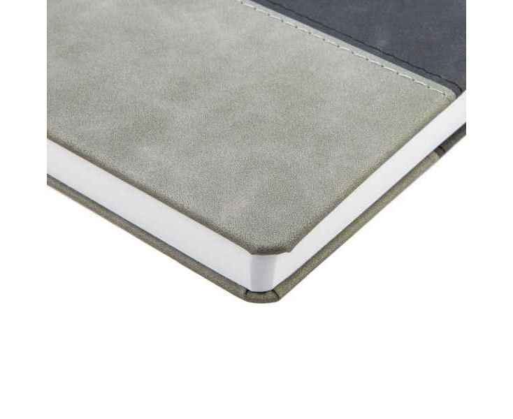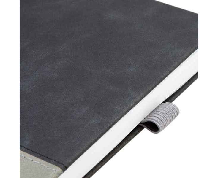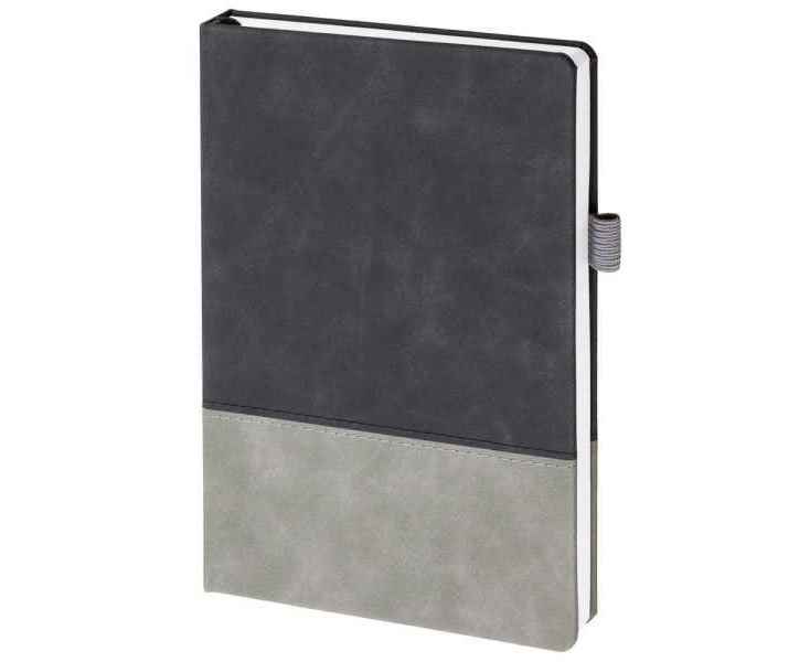 Ежедневник с твердой обложкой, без поролона, со сшивкой материалов Nubuck Touch, серый СС, и Nubuck Touch черный АА, дополнен двойным ляссе и петлей-резинкой для ручки.