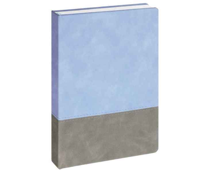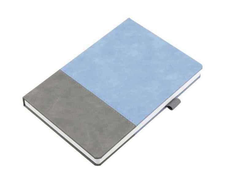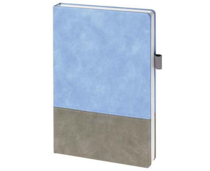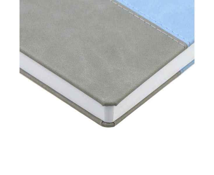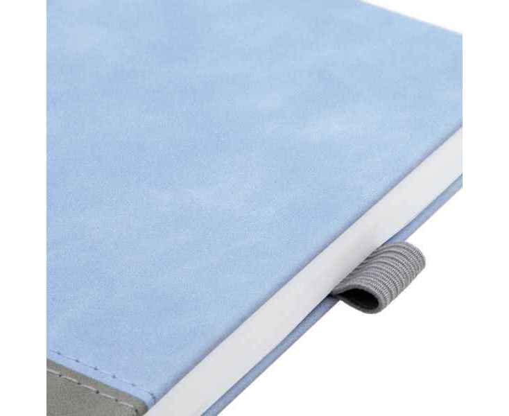 Ежедневник с твердой обложкой, без поролона, со сшивкой материалов Nubuck Touch, серый СС, и Nubuck Touch голубой JJ, дополнен двойным ляссе и петлей-резинкой для ручки.