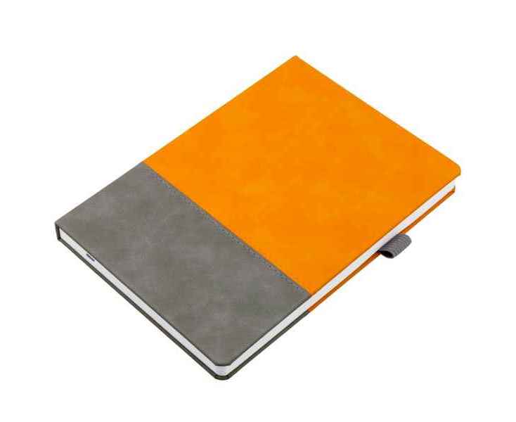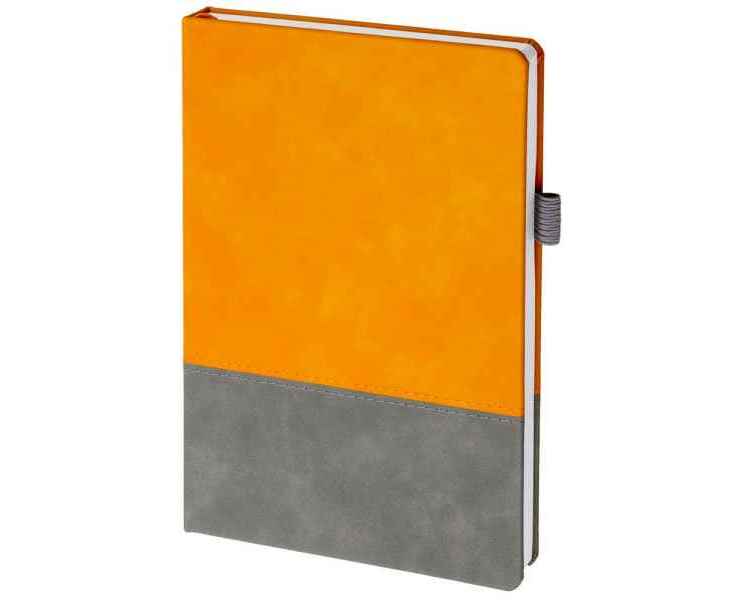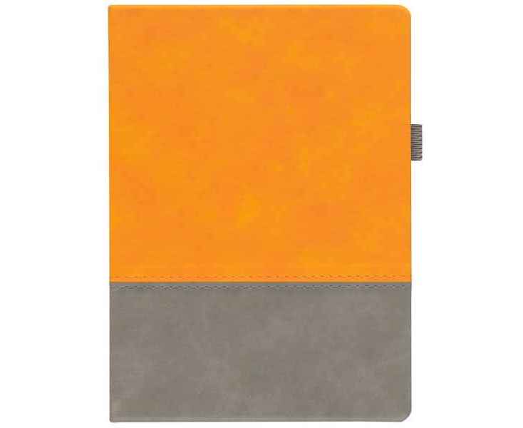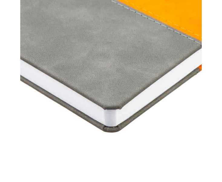 Ежедневник с твердой обложкой, без поролона, со сшивкой материалов Nubuck Touch, серый СС, и Nubuck Touch оранжевый ОО, дополнен двойным ляссе и петлей-резинкой для ручки.