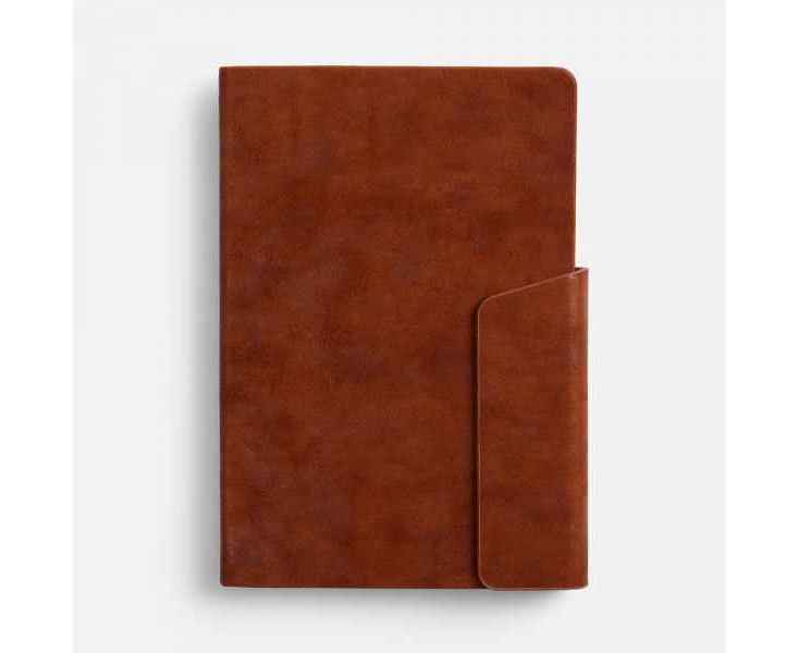 Ежедневник с твердой обложкой и фигурным магнитным клапаном, дополнен капталом и двойным ляссе.