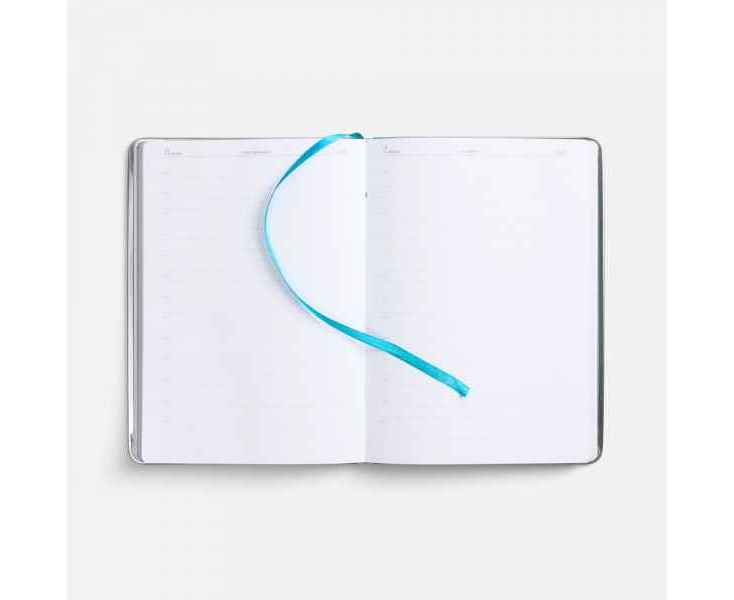 Ежедневник с твердой обложкой и серебристым обрезом блока. Выполнен из материала Nubuck, цвет мроской волны, дополнен цветным ляссе и металлическими рамками с двух сторон обложки.