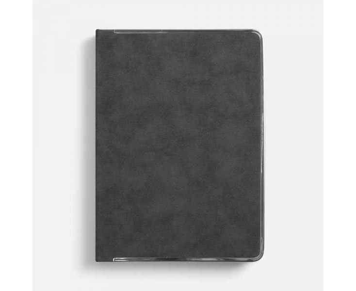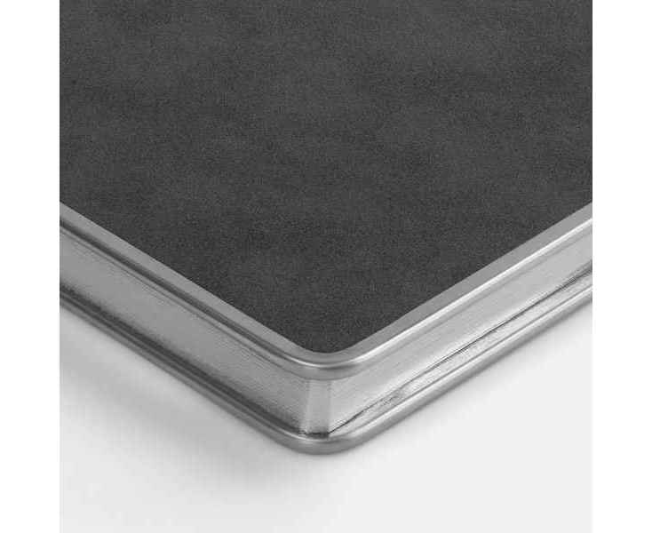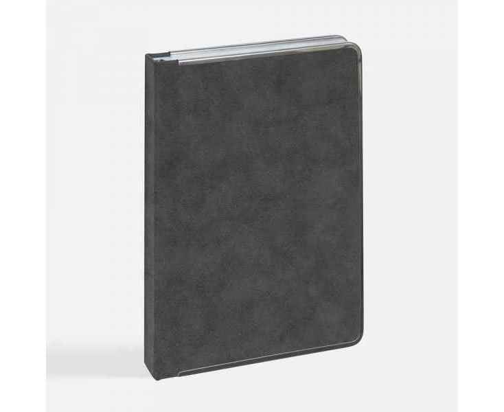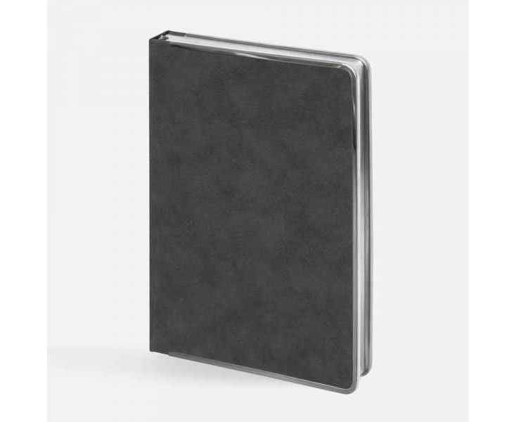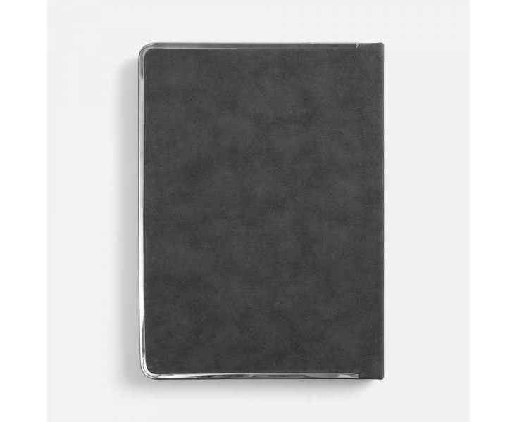 Ежедневник с твердой обложкой и серебристым обрезом блока. Выполнен из материала Nubuck, темно-серый ЕЕ, дополнен серым ляссе и металлическими рамками с двух сторон обложки.