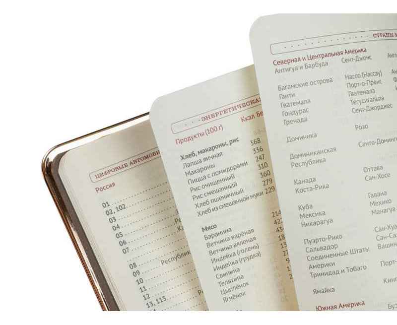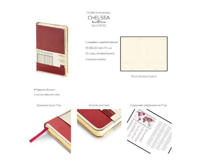 В ежедневнике Chelsea есть полезная справочная информация и телефонная книга, а также 272 страницы для записи идей, мыслей и составления рабочих планов. Есть закладка - тесьма из шелка, она интегрирована в обложку и может использоваться как хлястик. Для изготовления страниц используется качественный бежевый офсет повышенной плотности (70 г/кв м), которая производится в Японии и подходит для всех видов чернил. Бордовое ляссе, совпадающее по цвету с капталом, служит для удобного перехода к текущей дате.